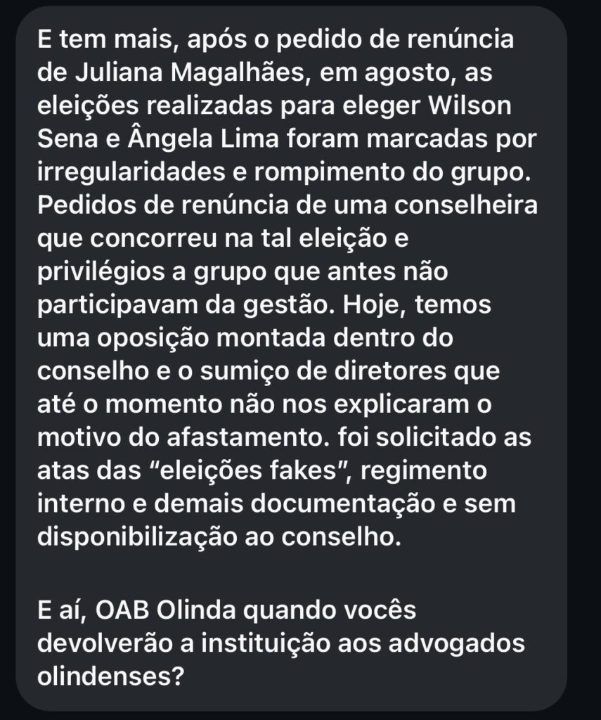 Por Luiz Roberto Marinho – Conselheiros da subseção de Olinda da OAB-PE acusam o presidente e a vice-presidente, Wilson Sena Brasil e Ângela Silva Lima, em conversas de WhatsApp, de estarem usando a instituição para fins privados, “num verdadeiro escárnio”, conforme uma das mensagens.