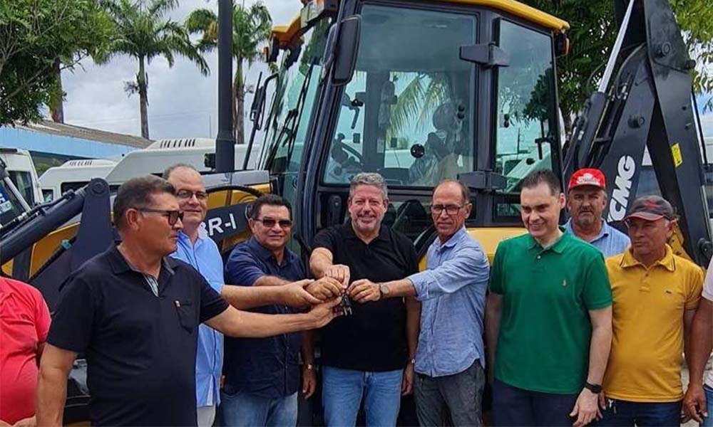 Em abril, o presidente da Câmara, Arthur Lira (ao centro, de preto), entrega retroescavadeira comprada pela Codevasf, em Penedo (AL).