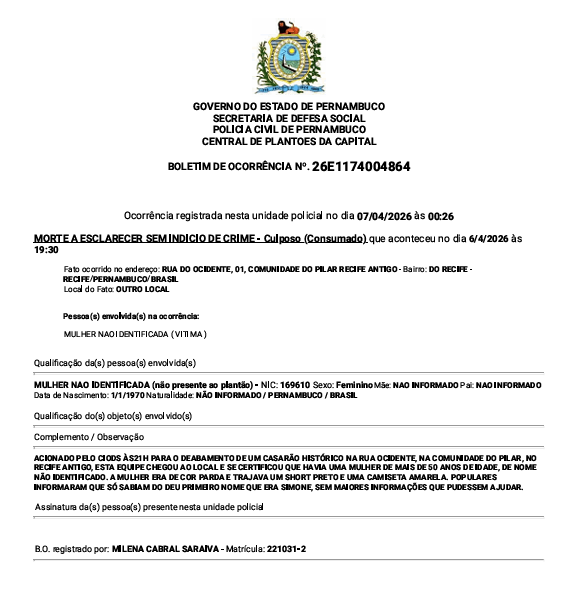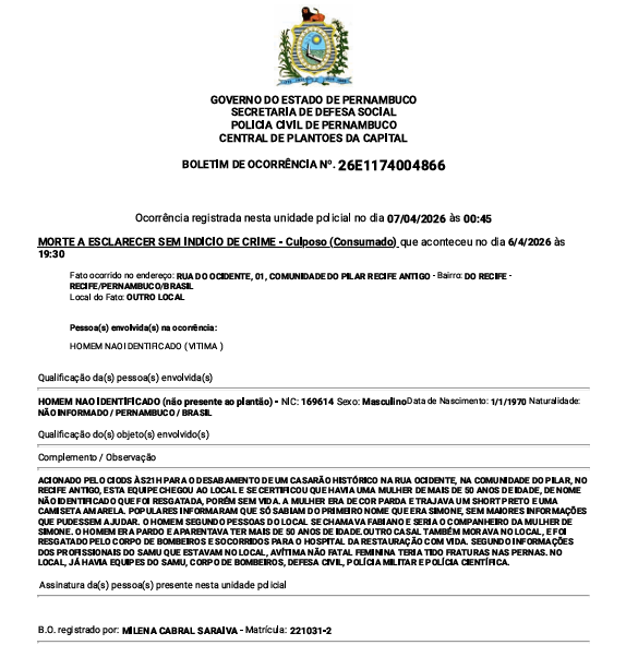 Da Redação – Até a manhã esta terça-feira (07), o homem e a mulher, que morreram no desabamento de um casarão histórico na comunidade do Pilar, no Recife Antigo, não foram identificados. Os dois boletins de ocorrência da Polícia Civil foram classificados como “morte a esclarecer sem indício de crime – culposo (consumado)”.
