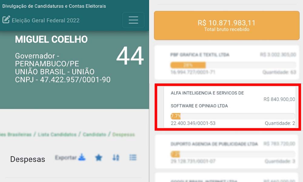 O ex-prefeito, candidato a uma das vagas ao Senado ou a vice-governador na chapa de João Campos, pagou R$ 840 mil à Alfa Inteligência para trabalhar na sua campanha ao governo do estado, em 2022, conforme dados da sua prestação de contas ao TSE (Tribunal Superior Eleitoral).