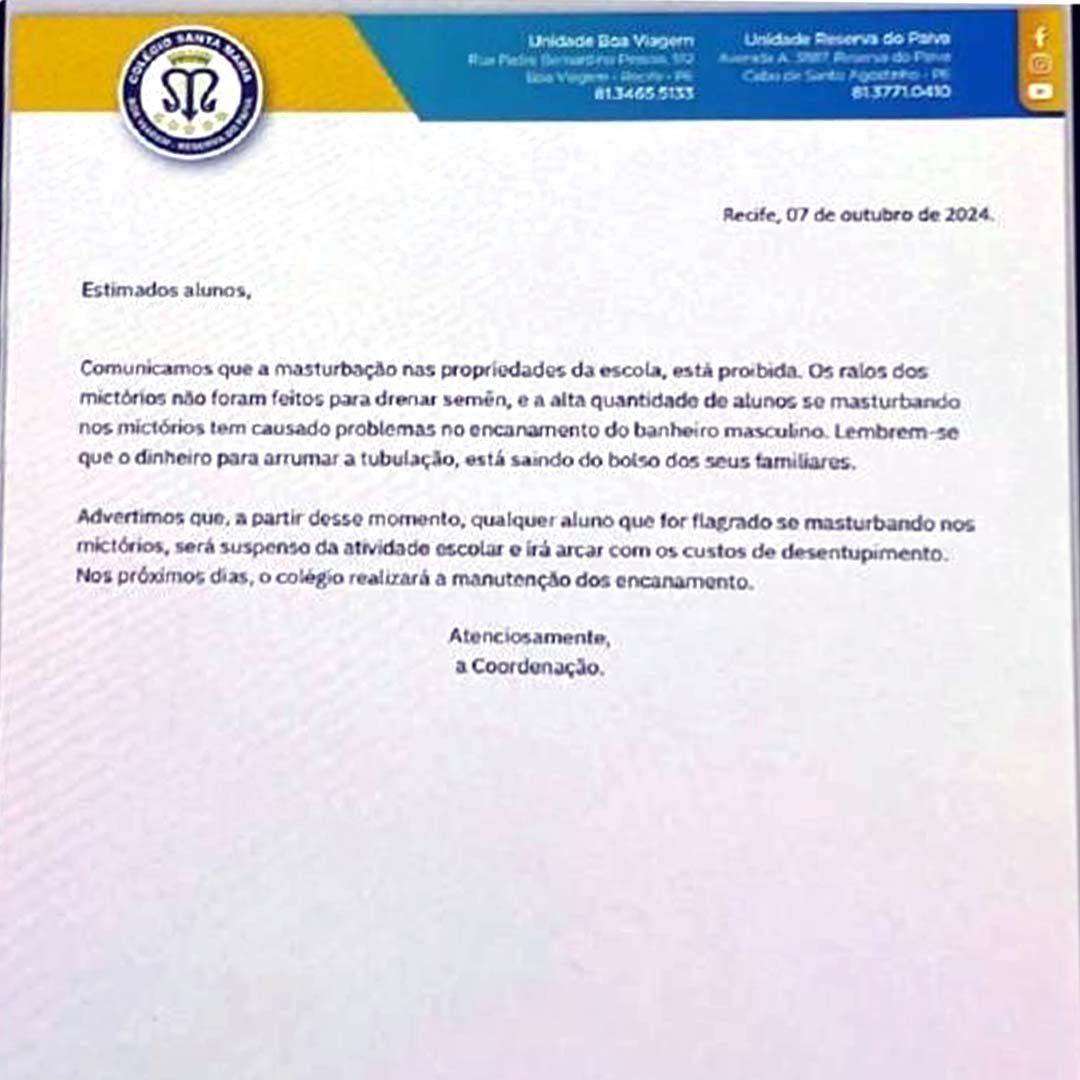 Com a logomarca do colégio e assinado pela “Coordenação”, o comunicado diz que “os ralos dos mictórios não foram feitos para drenar semên (sic) e a alta quantidade de alunos se masturbando nos mictórios tem causado problemas no encanamento do banheiro masculino”.
