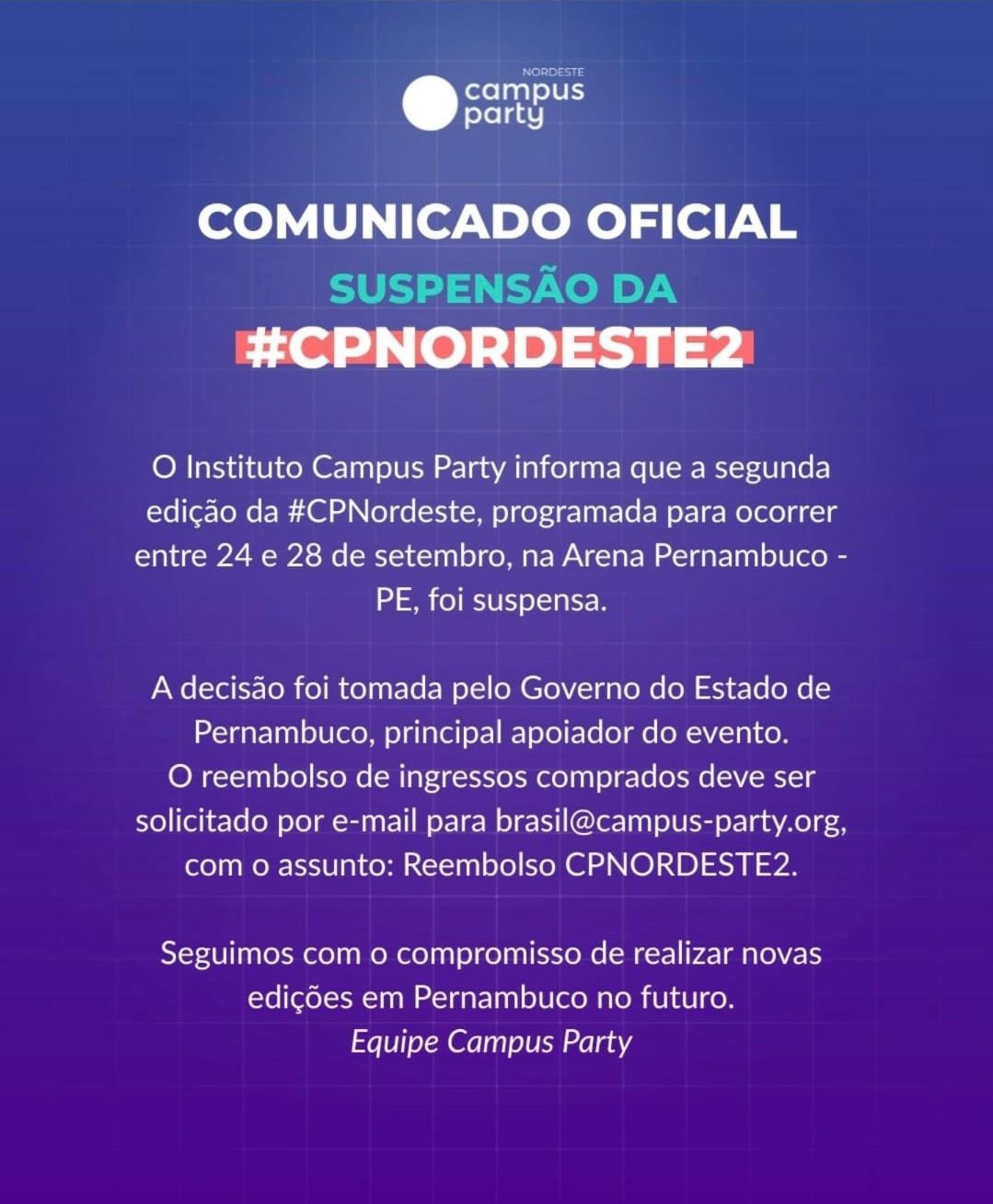 “A organização lamenta profundamente a situação e reforça o seu interesse em realizar mais uma edição em Pernambuco”, comunicou o Instituto Campus Party, em nota.
