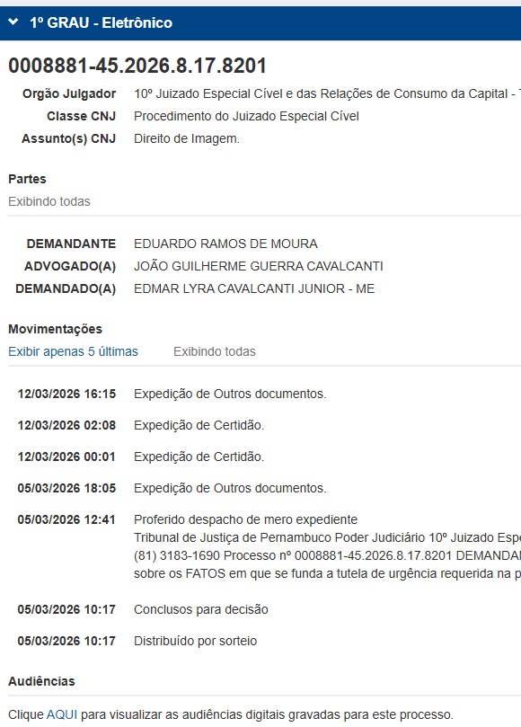 O vereador, por sua vez, ingressou com ação no Tribunal de Justiça de Pernambuco contra o jornalista Edmar Lyra, alegando violação de direito de imagem. Conforme os autos, em 5 de março de 2026 houve despacho determinando a intimação do jornalista para se manifestar no prazo de três dias, no contexto de análise de possível tutela de urgência.