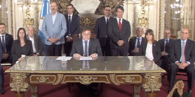 Do Estadão – O presidente da Argentina, Javier Milei, assinou o Decreto de Necessidade e Urgência (DNU), que promove uma desregulamentação da economia do país através da modificação de 30 leis em 366 artigos. O documento, de 83 páginas, foi divulgado em um pronunciamento em rede de rádio e TV, nesta quarta-feira, 20.