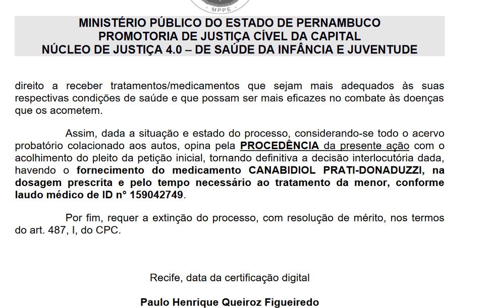 No parecer do MMPE, o promotor Paulo Henrique Figueiredo, do Núcleo de Justiça de Saúde da Infância e da Juventude, escreveu que os pacientes têm o direito “a receber tratamentos/medicamentos que sejam mais adequados às suas respectivas condições de saúde e que possam ser mais eficazes no combate às doenças que os acometem”.