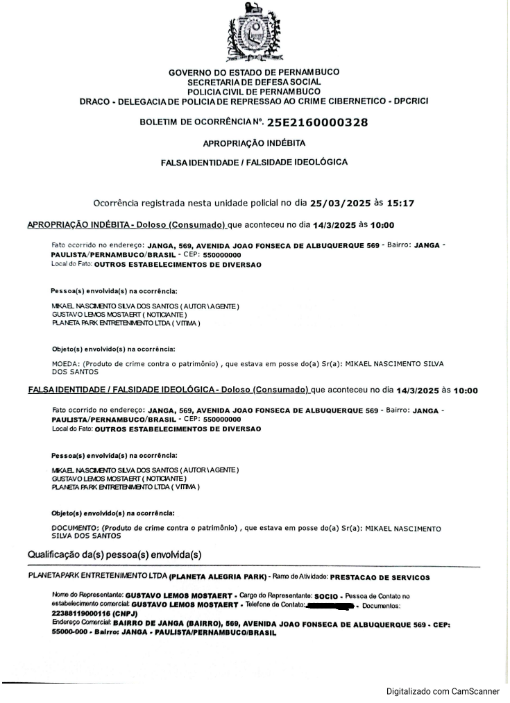 Por André Beltrão – Desvios estimados em cerca de R$ 250 mil, desde 2021, levaram o buffet infantil Planeta Alegria Park, muito requisitado em Olinda e Paulista, na Região Metropolitana do Recife, a demitir e pedir a prisão do seu gerente geral, Mikael Nascimento Silva dos Santos, e a assegurar aos clientes que não haverá nenhum prejuízo para as festas contratadas.