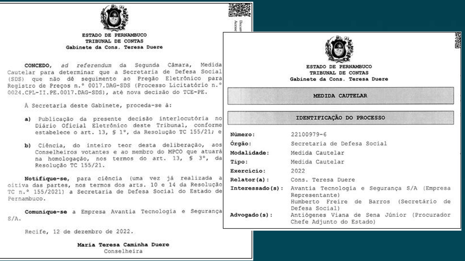 Cabe salientar que o antigo contrato de videomonitoramento, aquele com o preço 70% superior ao atual pretendido, firmado com o Consorcio composto pelas empresa Avantia, Oi e Vectra em 2015, que ficou vigente até o ano passado 2023 por meio de TAC (Termo de Ajustamento de Conduta) como uma medida excepcional, foi findado e o Tribunal de Contas do Estado – TCE PE exigiu que o novo processo licitatório fosse feito, porém houve tentativa do Estado de realizar a licitação em 2022 por meio do PE 0024.2022 até mesmo para tentar colocar o preço do contrato nos padrões do mercado.