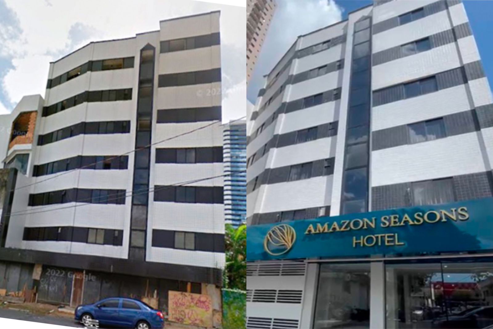 O antes (2018) e depois (2025) do prédio onde fica o Hotel da Ômega