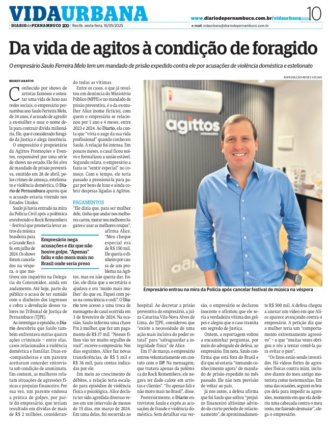 Saulo é considerado fugitivo da Justiça, segundo o Diário de Pernambuco, e estaria nos Estados Unidos. Ele nega ser foragido.