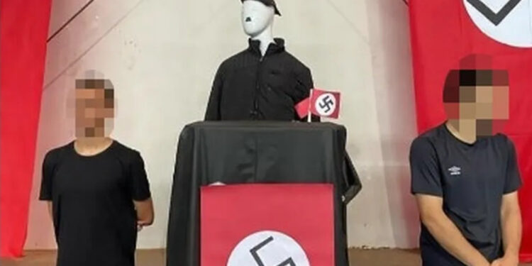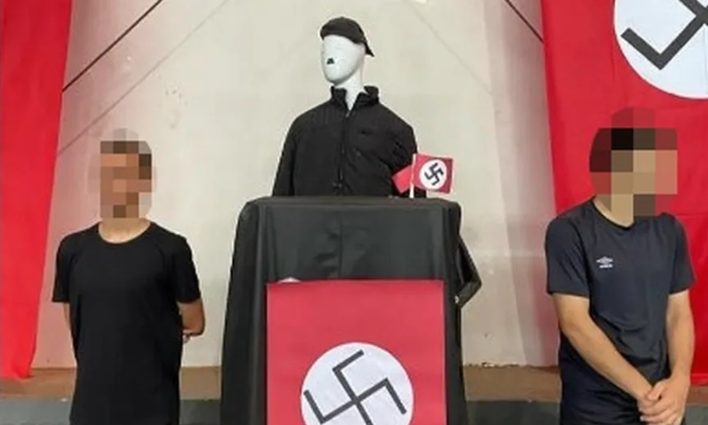 Além disso, os alunos também levaram símbolos nazistas para sala de aula e um dos estudantes aparece com um boné com a suástica.