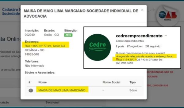 O escritório da advogada Maísa de Maio Marciano tem endereço, conforme registrado no cadastro nacional da Ordem dos Advogados do Brasil (OAB), em uma sala compartilhada do bairro Setor Sul da capital goiana. Na internet, o espaço diz oferecer serviços de aluguel de salas, sala de reunião e endereço fiscal.
