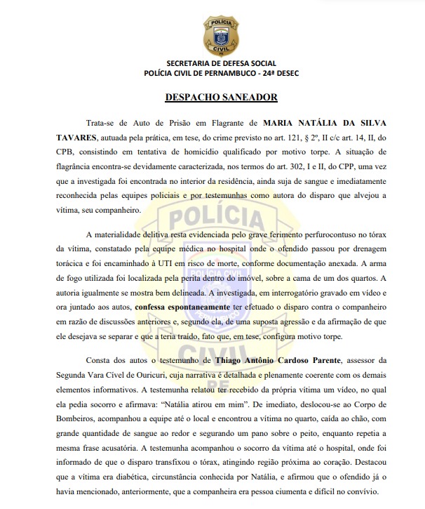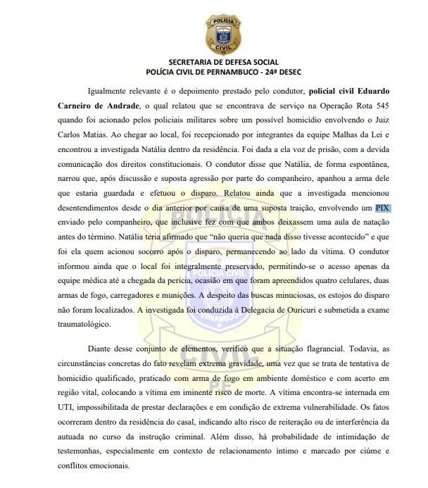 A delegada Camila Nogueira pediu à Justiça a conversão da prisão em flagrante de Maria Natália em prisão preventiva, por tentativa de homicídio qualificado por motivo torpe. Um dos médicos que atendeu Carlos Mathias informou ao assessor do juiz na Vara de Ouricuri que o tiro foi próximo ao coração e colocou a vítima em perigo de morte.