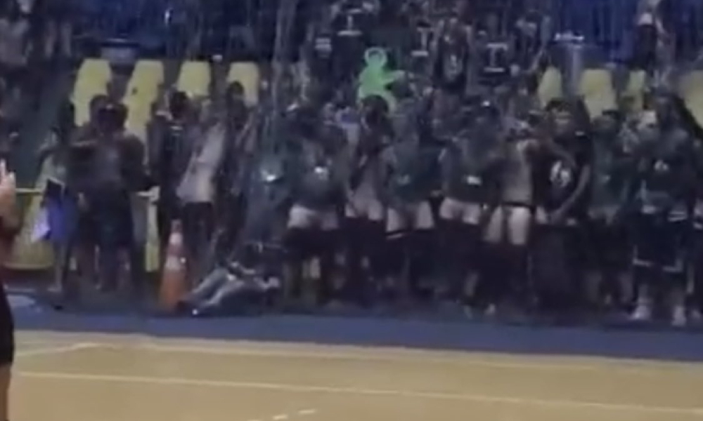 Nas imagens, é possível ver um grupo de homens correndo em uma quadra, com os shorts abaixados, em uma espécie de “volta olímpica”. Em outra imagem, eles se tocam enquanto assistem a um jogo de vôlei feminino.
