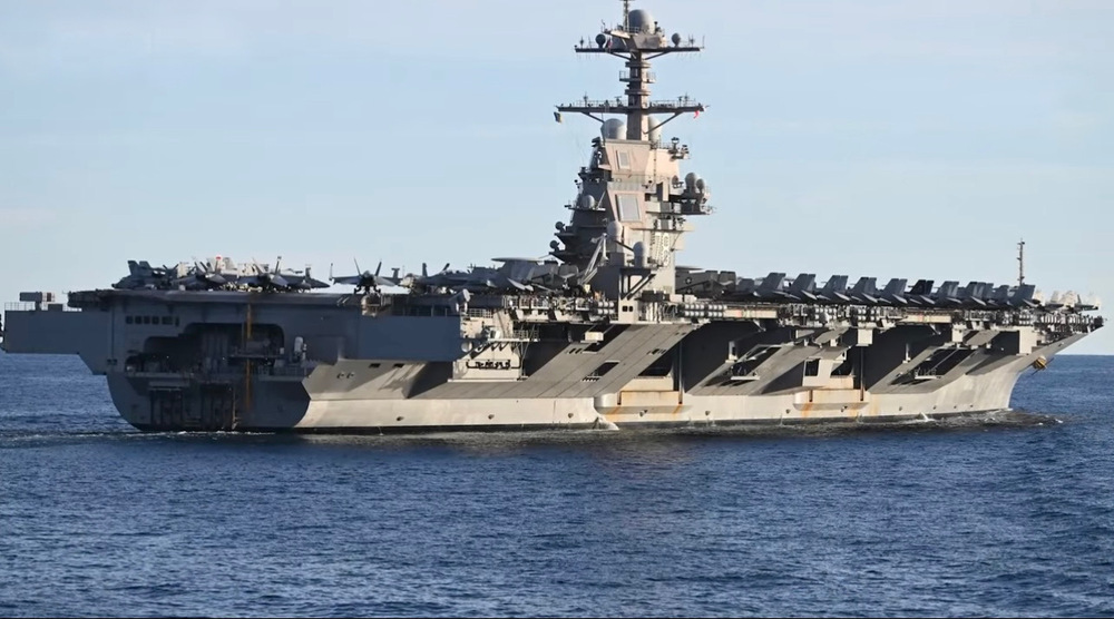 Porta-aviões USS Gerald R. Ford, considerado o “mais avançado” da sua categoria. O navio está no Mediterrâneo e segue em direção ao Caribe.