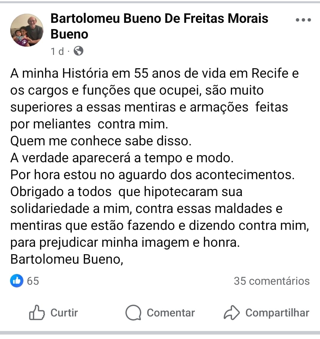 Em suas redes sociais, o desembargador aposentado Bartolomeu Bueno reafirmou que é inocente: “Minha história em 55 anos de vida em Recife e os cargos e funções que ocupei, são muito superiores a essas mentiras e armações feitas por meliantes contra mim. A verdade aparecerá a tempo e modo (…)”, escreveu