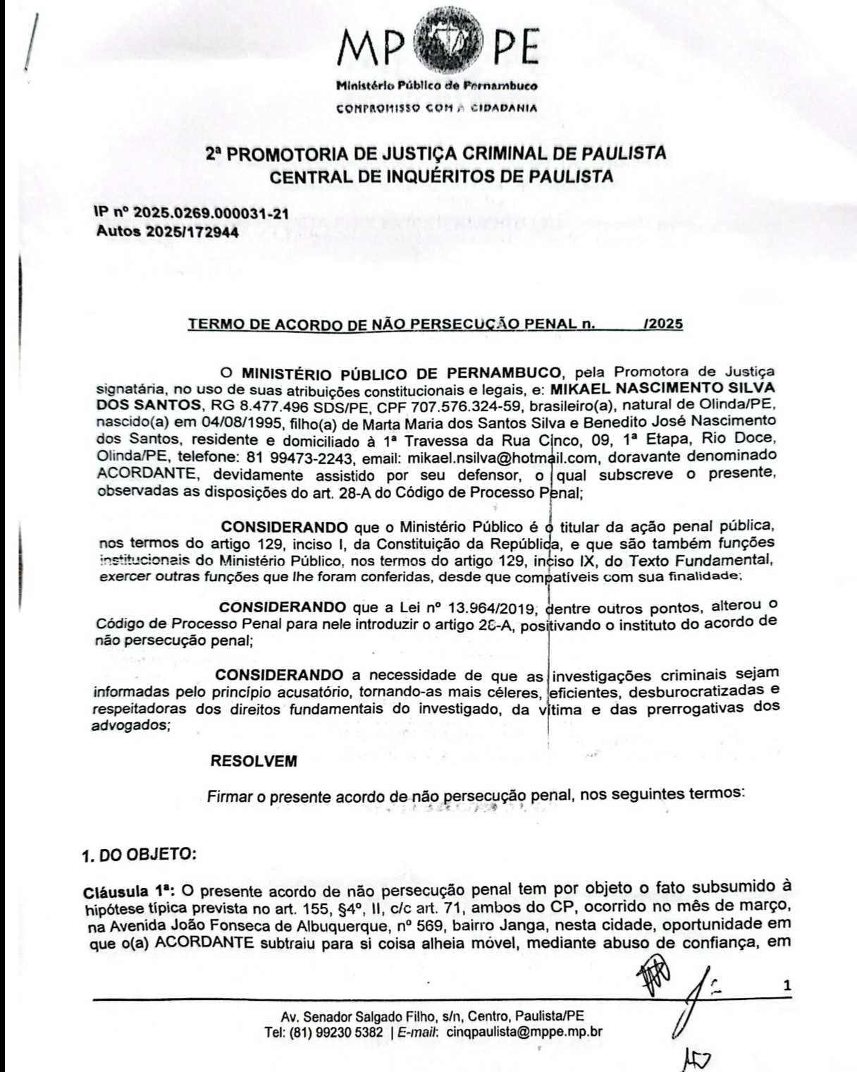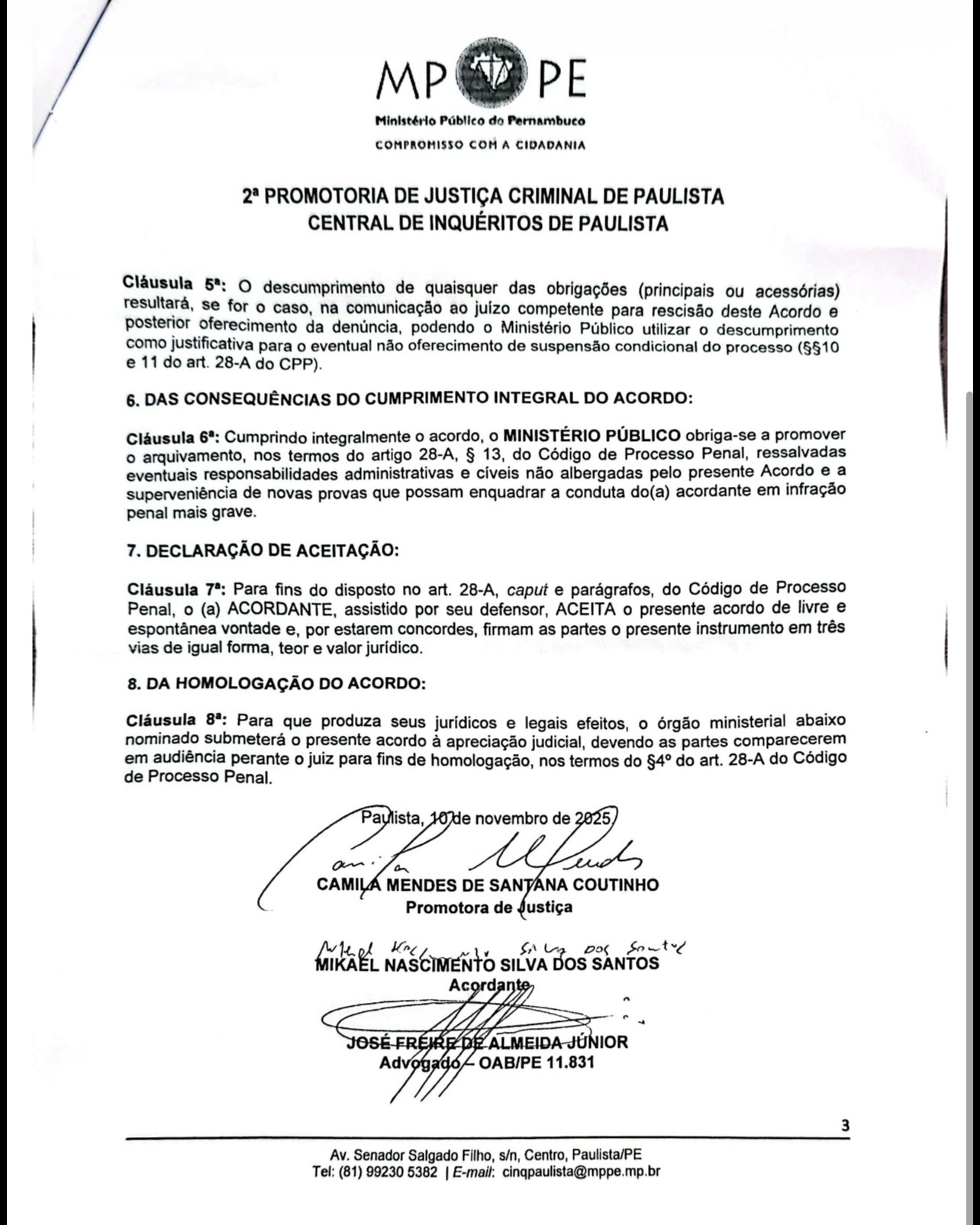 Da Redação do Blog – Considerado culpado por desvios superiores a R$ 200 mil na empresa de festas infantis Planeta Alegria Park, seu ex-gerente, Mikael Nascimento Silva dos Santos, 29 anos, firmou acordo com o Ministério Público de Pernambuco (MPPE) pelo qual cumprirá pena de serviços comunitários por dois anos, à razão de quatro horas semanais.