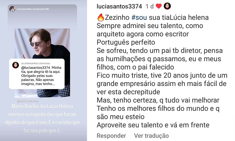 José Bernardino Pereira dos Santos Filho, o Zezinho, cujo pai, José Bernardino, é irmão de Fernando Santos, escancarou os bastidores familiares em sua página no Instagram. À moda de outras celebridades, mandou às favas desavenças familiares normalmente restritas a escritórios de advogacia, botando a boca no trombone.