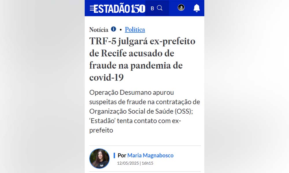 Ele é investigado na Operação Desumano por suspeitas de fraude na contratação de uma Organização Social de Saúde durante a pandemia de covid-19, envolvendo secretários de saúde de Recife e Jaboatão dos Guararapes.