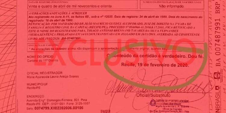 Por Ricardo Antunes – O empresário Thiago Antônio Fernandes Vieira, 42, que fugiu do Brasil, usou um sobrenome falso de uma tradicional família pernambucana, apenas para ostentar. Documentos obtidos pelo Blog, com exclusividade, comprovam a farsa, que enganou até o programa Fantástico, da TV Globo. Thiago nunca foi Brennand, como vinha sendo afirmado. Pelo menos até fevereiro de 2020, quando solicitou a incorporação do sobrenome, mas seu nome de batismo é Thiago Antônio Fernandes Vieira.