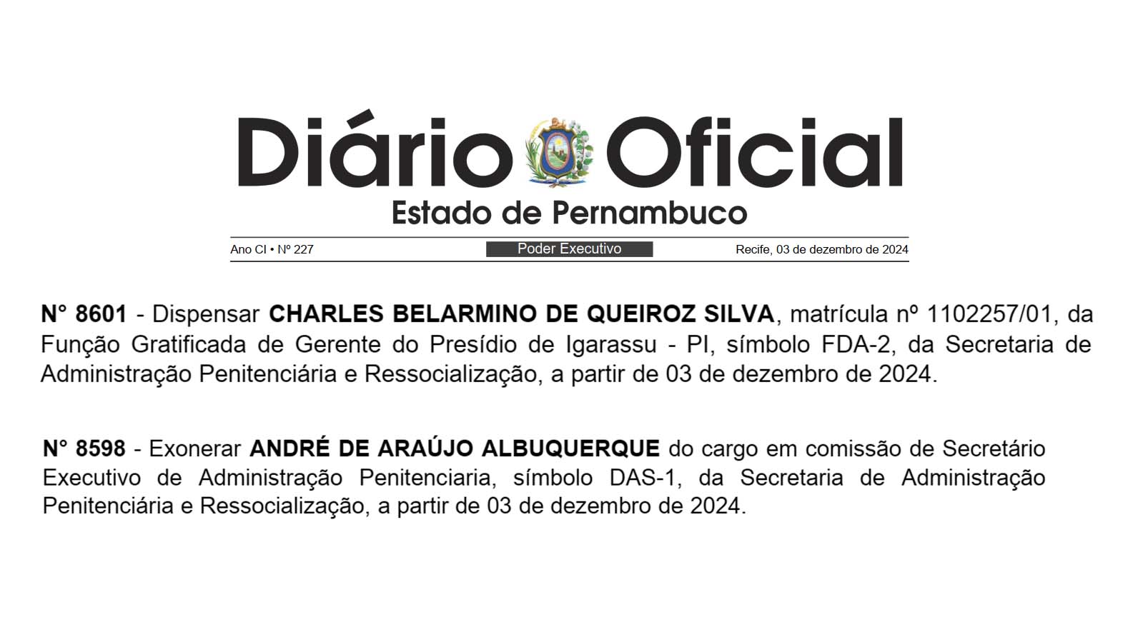 O secretário da SEAP, Paulo Paes, policial penal de carreira, substituiu André Albuquerque pelo ex-diretor do Presídio de Pesqueira, no Agreste, Kleiber Oliveira Galindo, enquanto Charles Belarmino foi trocado pelo diretor da Penitenciária Agrícola de Itamaracá, na RMR, Carlos Alberto Cordeiro.