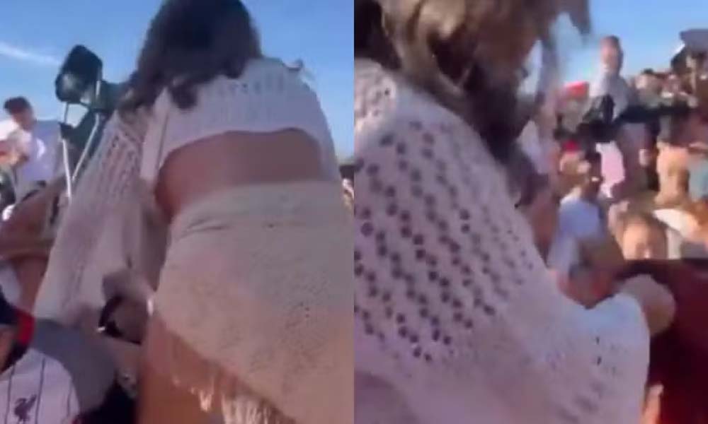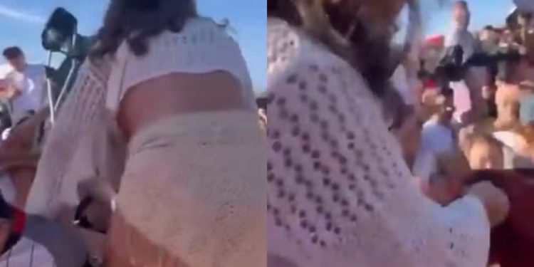 Nas imagens, duas mulheres aparecem brigando e uma delas acaba puxando o cabelo da outra. “Meu Deus, vai embora”, diz um fã que estava por perto, enquanto outro grita: “Solta”.