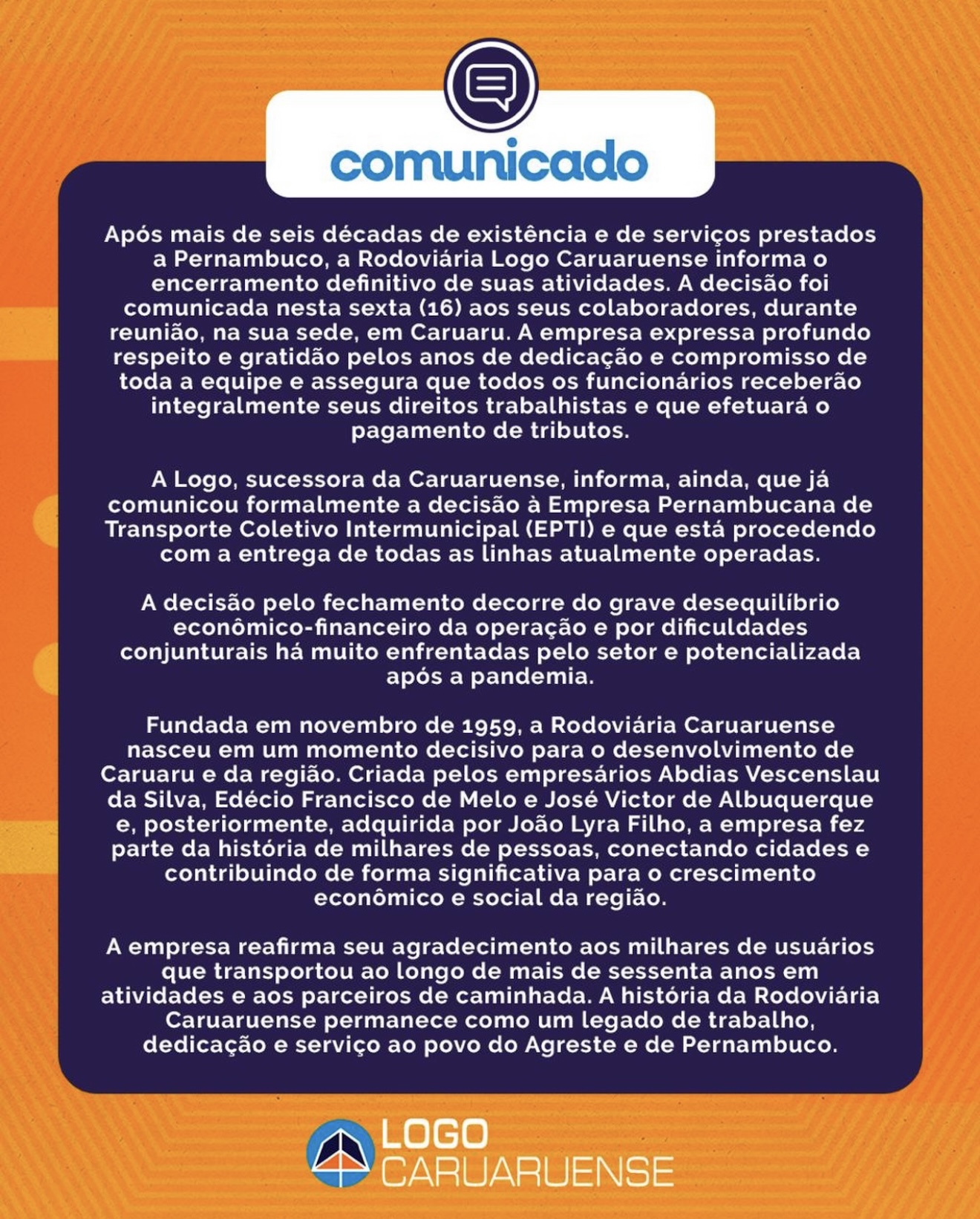 Por Luiz Roberto Marinho – A empresa Logo Caruaruense, pertencente ao ex-governador João Lyra, pai da governadora Raquel Lyra (PSD), oficializou seu fechamento em comunicado nesta sexta-feira (16) garantindo que cumprirá as obrigações trabalhistas e pagará os impostos atrasados. A informação foi antecipada pelo nosso Blog.
