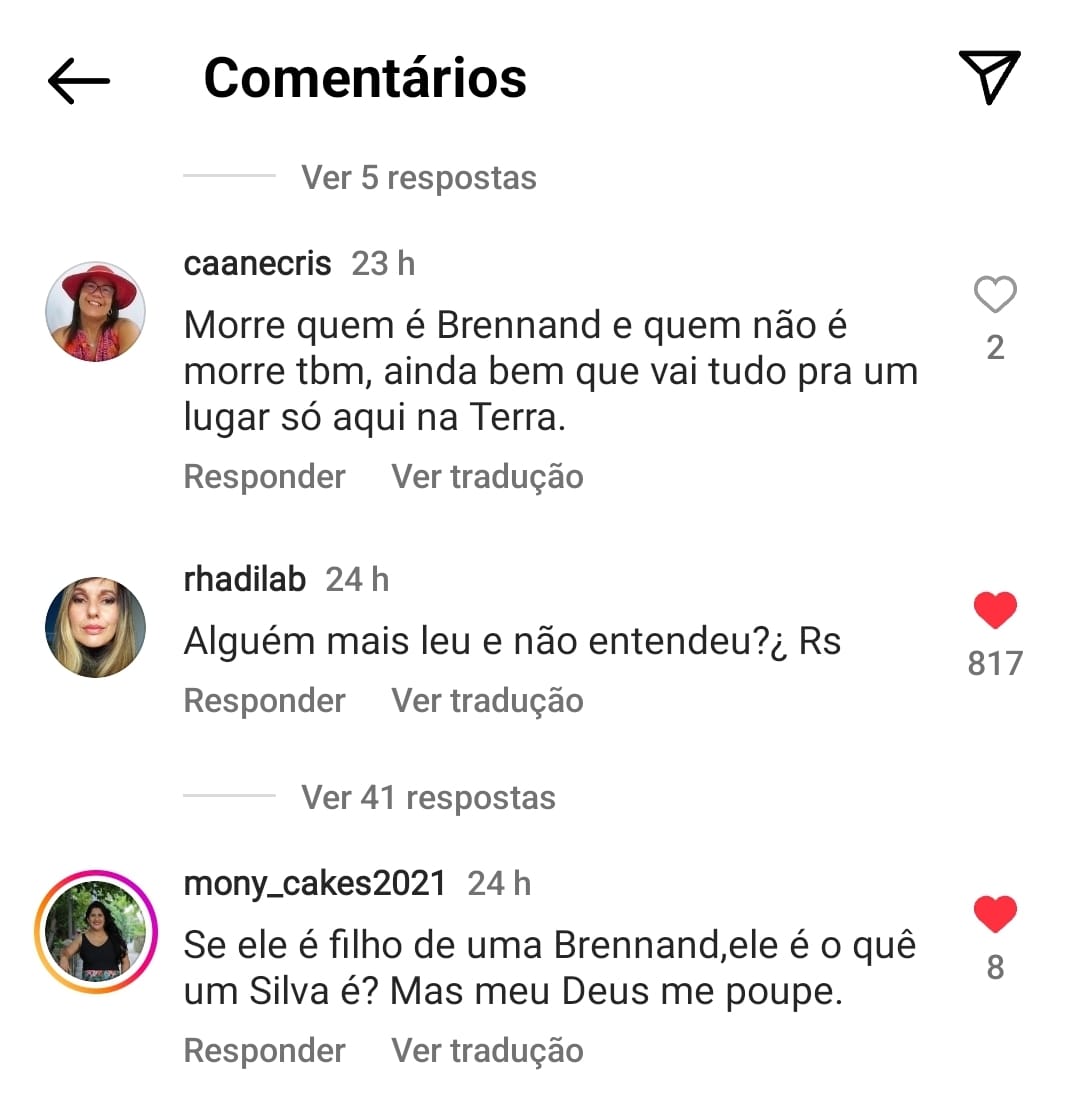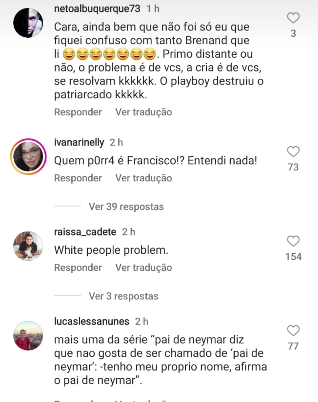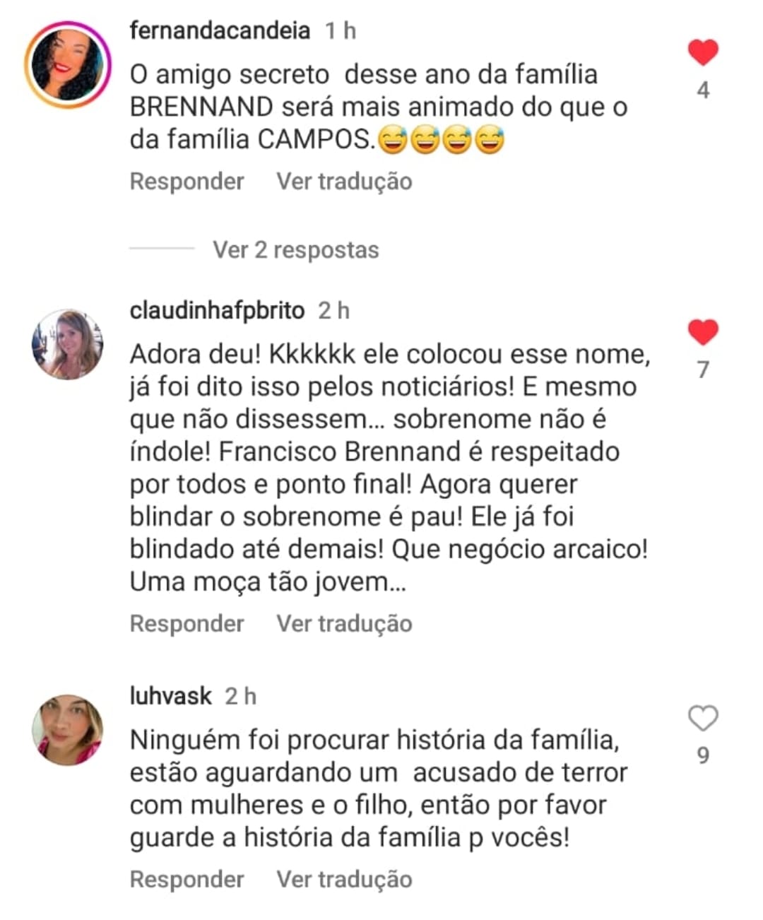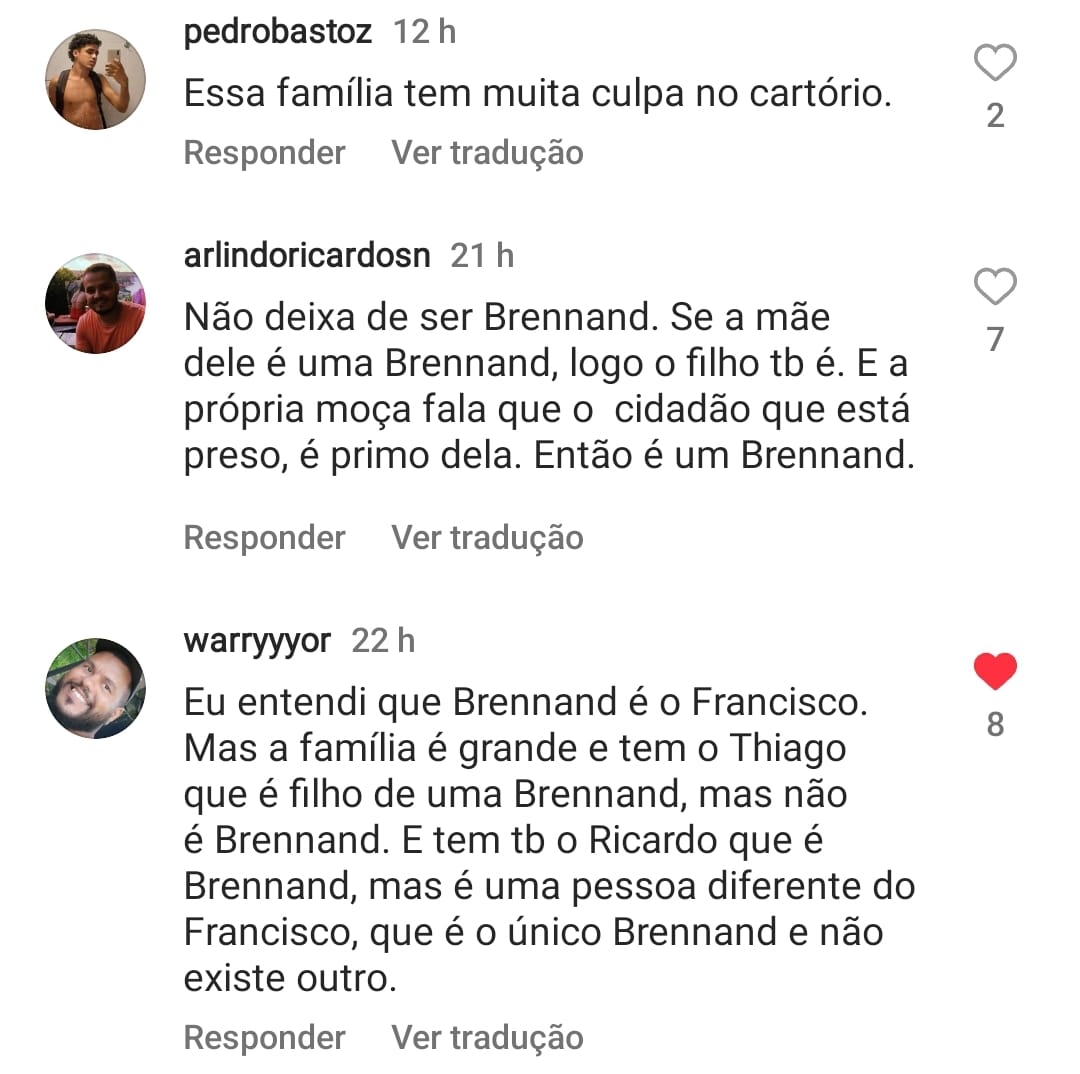 “Moça, se ele é filho de uma Brennand, então ele é Brennand”. Em outra postagem um comentário diz: “Desde 2003, ele é um Brennand sim, pois ao contrário, ele já estaria preso há muito tempo”.