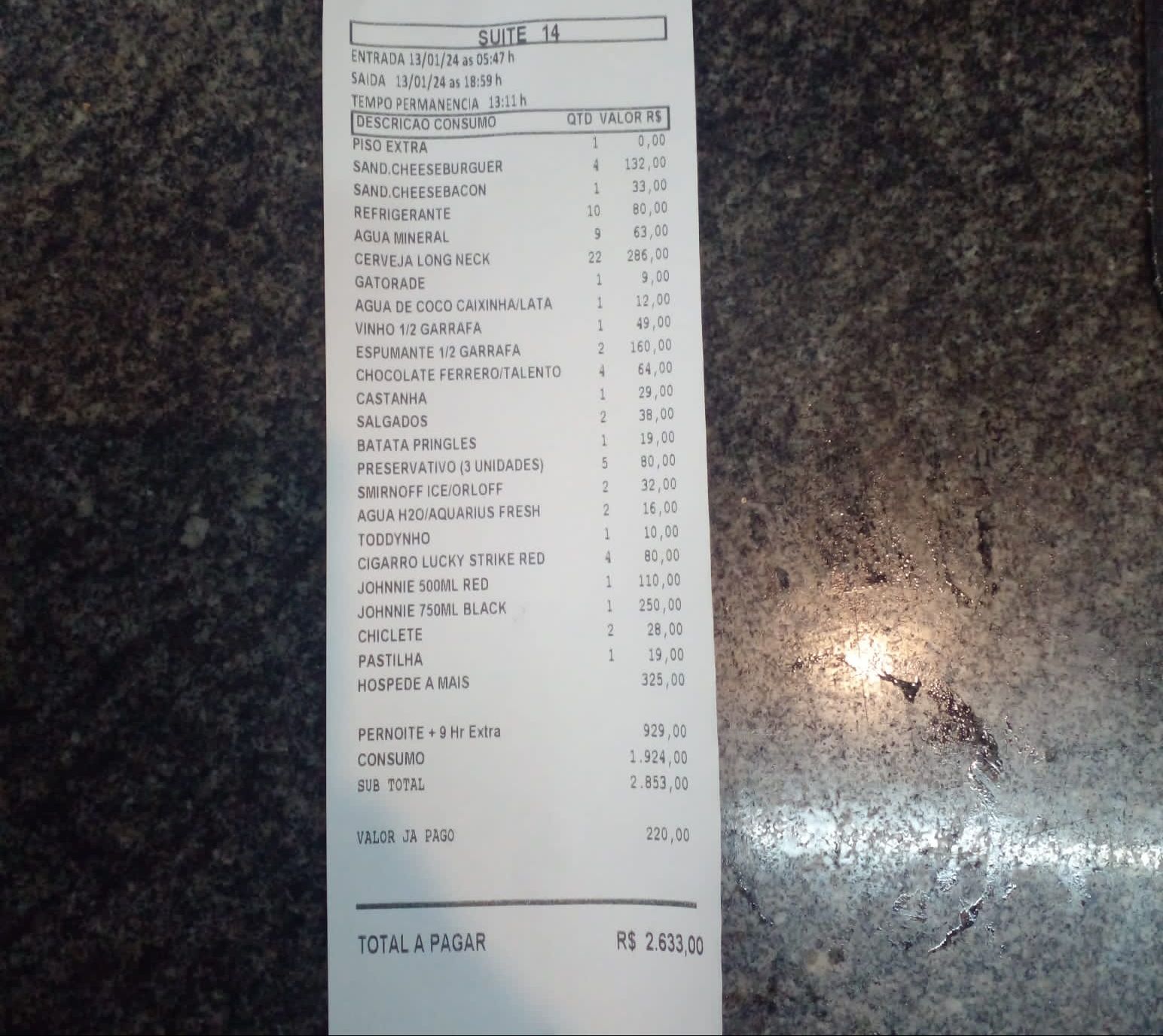 Até aí tudo bem, pois a vida pessoal é de cada um. O problema foi na hora de pagar a conta de quase R$ 3 mil. Na nota a que tivemos acesso, rolou espumante, whisky 12 anos, Gatorade e até Toddynho.