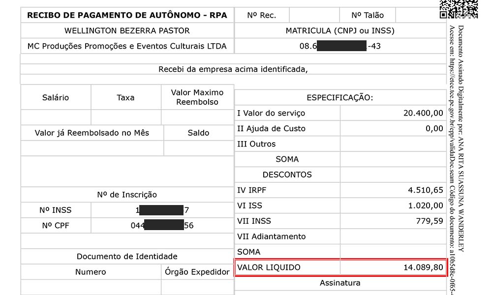 O depósito da empresa MC na sua conta do Banco do Brasil descontou Imposto de Renda, ISS e INSS, totalizando um pagamento líquido de R$ 14.089,80, efetuado no dia 27 de dezembro de 2023. Na Prefeitura, Wellington recebe um salário mensal bruto de R$ 9.521,10.