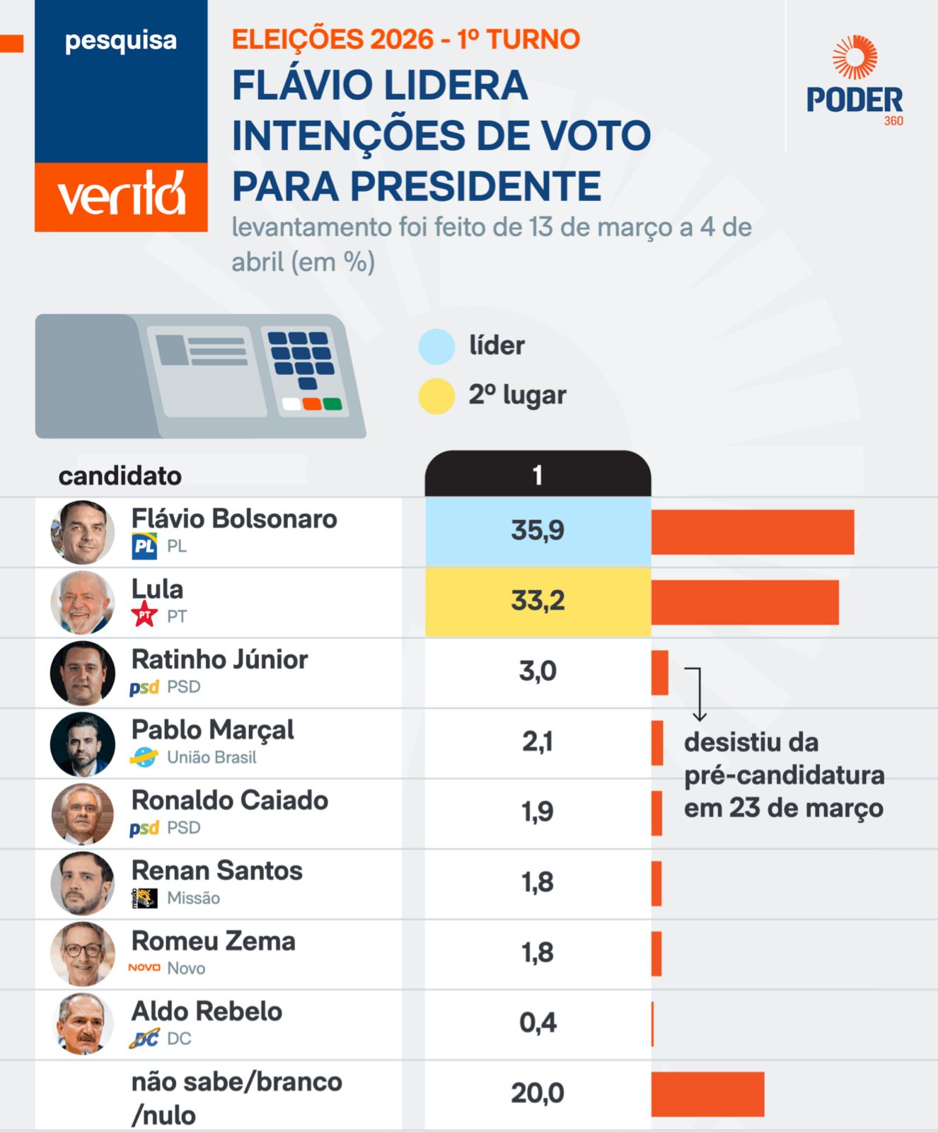 Do Poder 360 – O Instituto Veritá divulgou em seu perfil oficial no Instagram, nesta 5ª feira (9.abr.2026), uma pesquisa sobre intenções de voto para as eleições presidenciais em que o senador e pré-candidato à presidência Flávio Bolsonaro (PL-RJ) aparece liderando no cenário testado para o 1º turno. O presidente Luiz Inácio Lula da Silva (PT) ocupa a 2ª colocação.