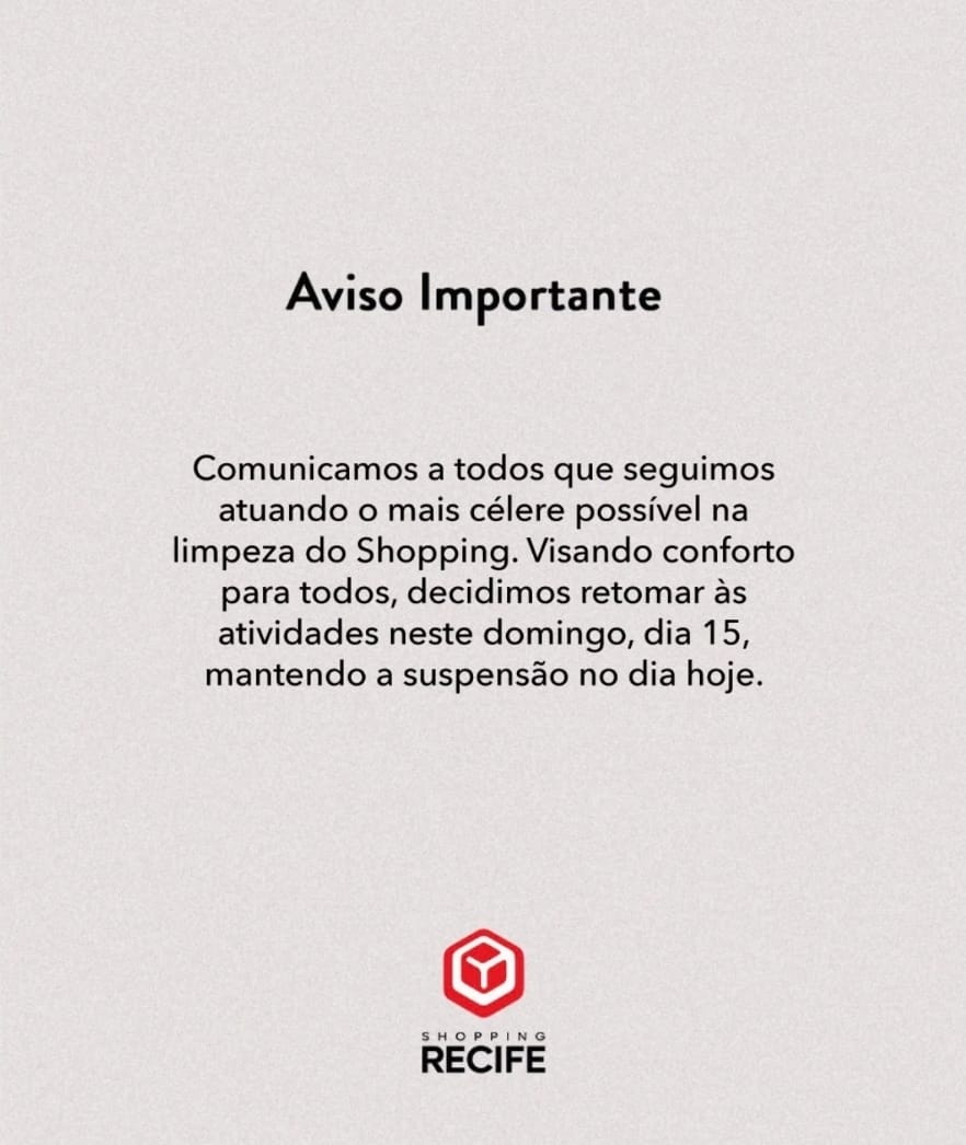 O Shopping Recife segue atuando de maneira célere na limpeza do mall. Após avaliação e visando conforto para todos, decidiu retomar as atividades amanhã (domingo, dia 15), mantendo a suspensão no dia de hoje.