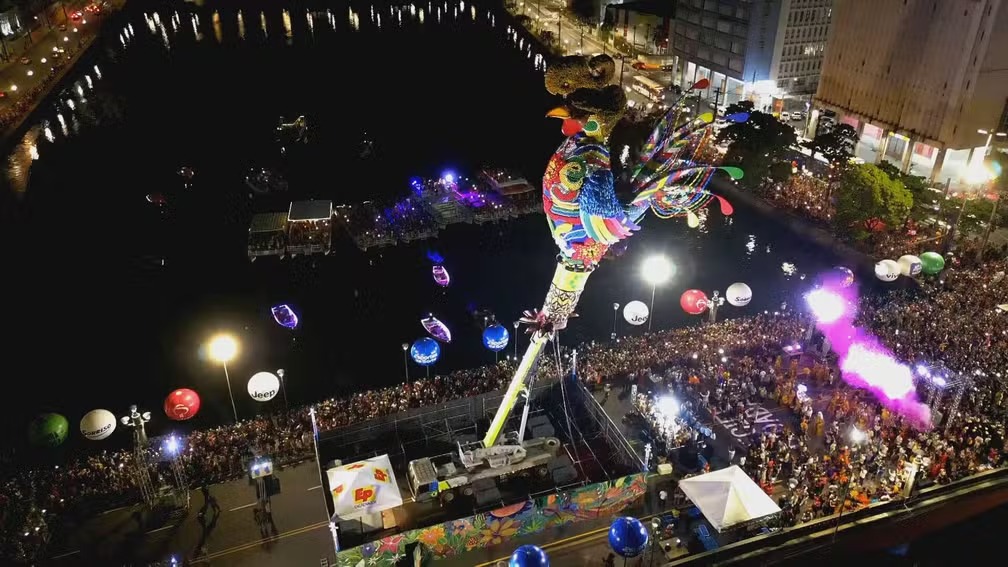 A neutralização de carbono realizada pela Ambipar abrange a produção do Galo Gigante, símbolo do bloco, erguido na noite de quarta-feira (26) na Ponte Duarte Coelho.