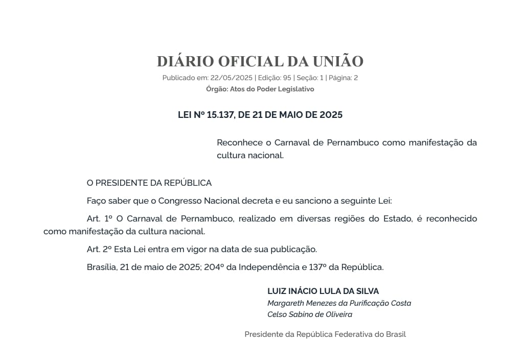 Da Assessoria – O presidente Lula sancionou a Lei 15.137/2025, que reconhece o carnaval de Pernambuco como manifestação da cultura nacional. A sanção foi publicada no Diário Oficial da União nesta quinta-feira, 22.