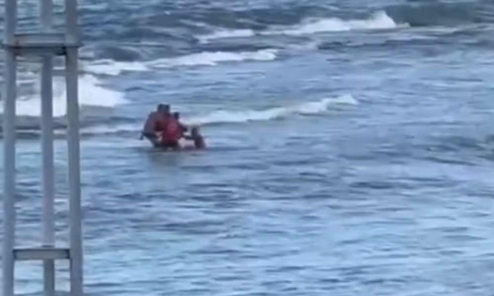 Um vídeo que circula nas redes sociais mostra o momento em que o banhista é retirado do mar carregado pelos guarda-vidas.