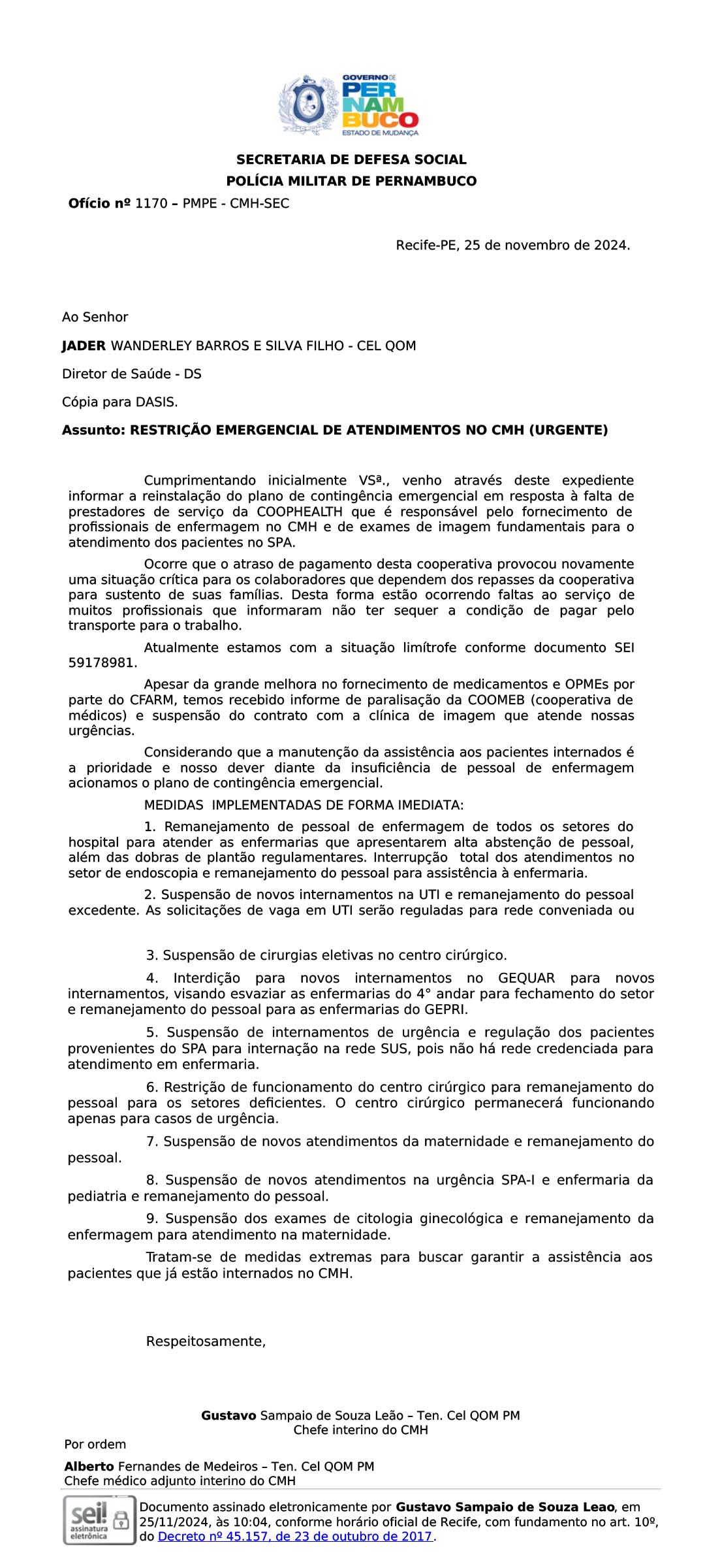 “Tratam-se de medidas extremas para buscar garantir a assistência aos pacientes que já estão internados no CMH”, relata o chefe interino do CMH, tenente-coronel Gustavo Sampaio de Souza Leão, em ofício ao diretor de saúde da PMPE, coronel Jader Wanderley Barros e Silva Filho, médico ortopedista. No ofício, ao qual o Blog teve acesso com exclusividade, é decretado o plano de emergência contingencial.