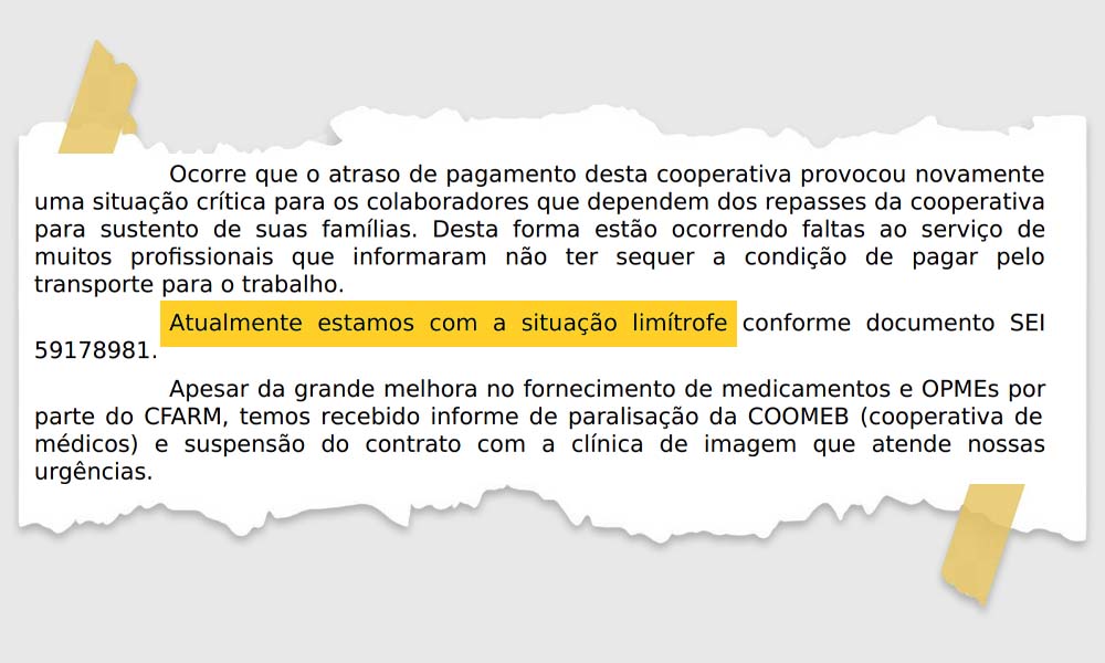 A situação crítica a que chegou o CMH, como descreve seu chefe interino, se deve à falta de pagamento à cooperativa que fornece enfermeiros, à cooperativa dos médicos e à clínica responsável pelos exames de imagem. “Estamos com a situação limítrofe”, relata Gustavo Sampaio de Souza Leão no ofício.