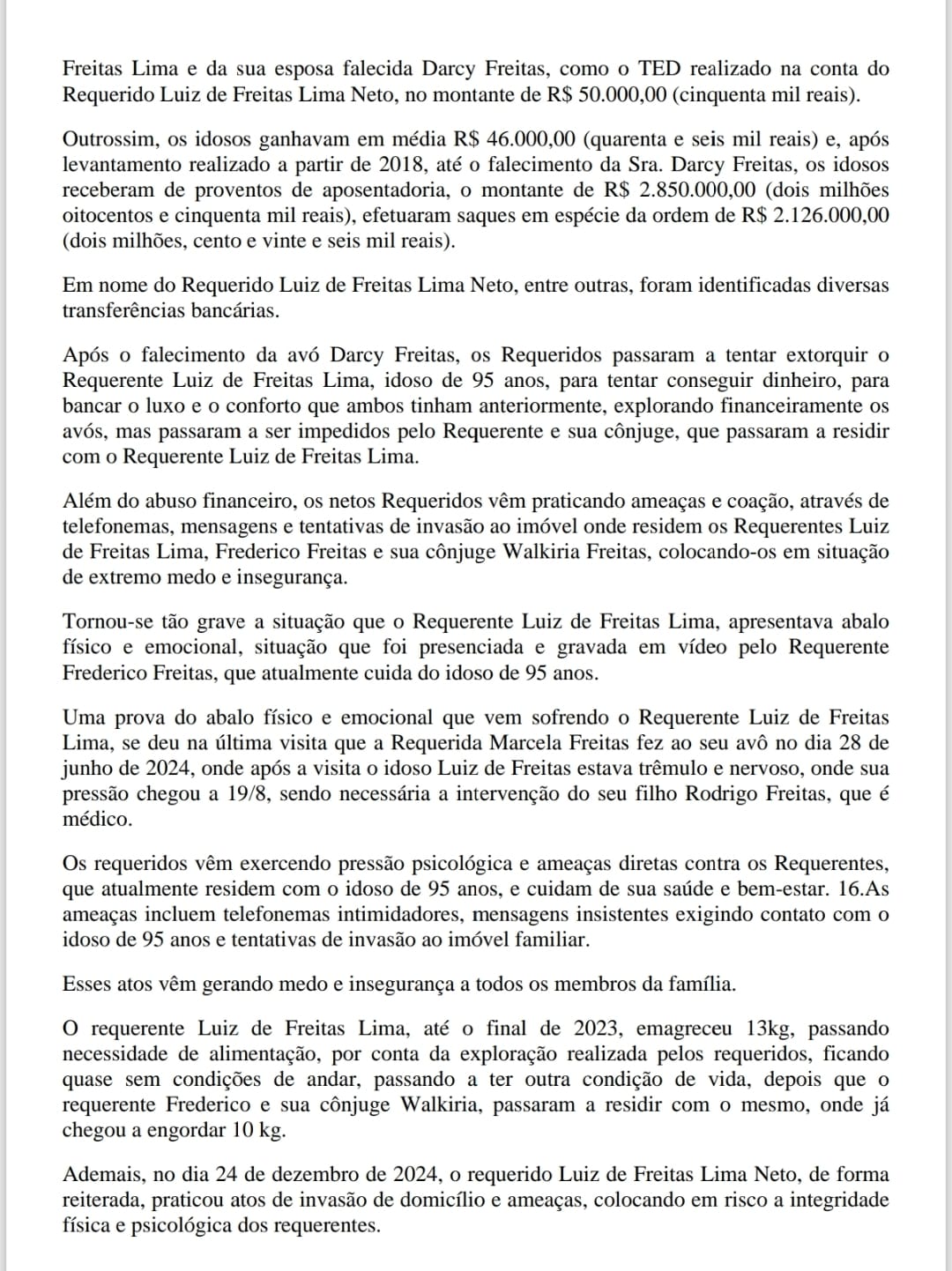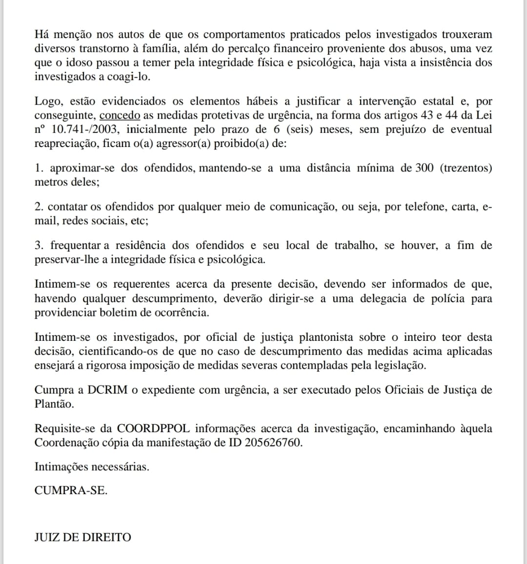 Após a morte da avó, em 2024, a dupla viria praticando “ameaças e coação, através de telefonemas, mensagens e tentativas de invasão do imóvel”. Os atos “vêm gerando medo e insegurança a todos os membros da família”.