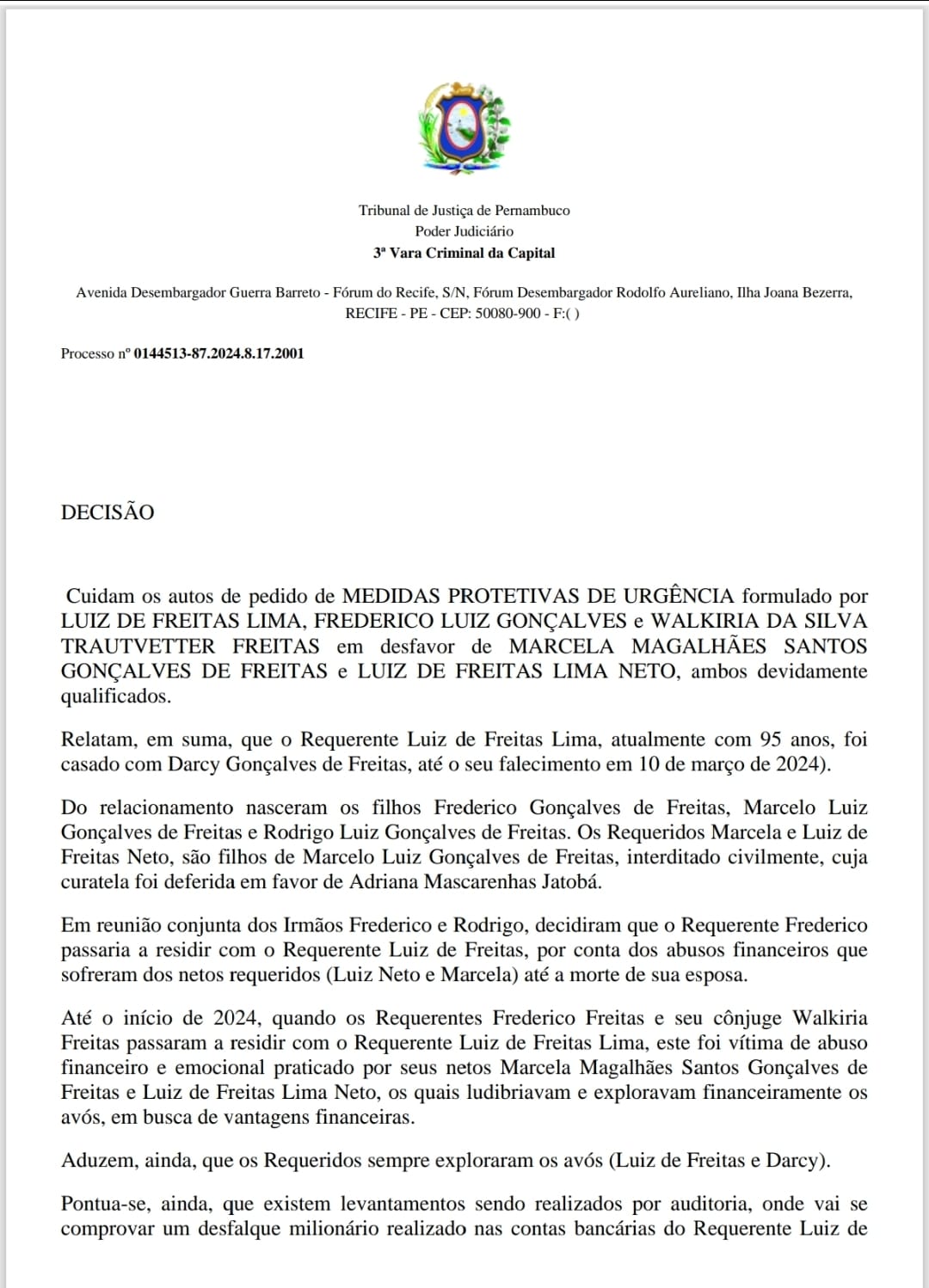 A coordenadora de Controle Interno da Arpe, Marcela Magalhães Santos Gonçalves de Freitas, e o coordenador de Tecnologia da Informação da agência reguladora, Luiz de Freitas Lima Neto, são irmãos. O avô deles, de 95 anos, alega que sempre foi vítima de abuso financeiro e emocional por parte dos servidores, e que estes sempre estavam “em busca de vantagens financeiras”, segundo denúncia feita à 3ª Vara Criminal da Capital.
