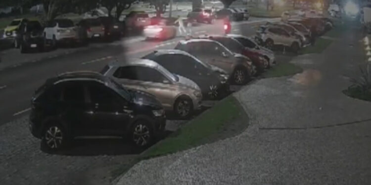 As imagens de câmera de segurança mostram o casal atravessando a rua quando um carro em alta velocidade atingiu Fábio, que foi arremessado para o alto.