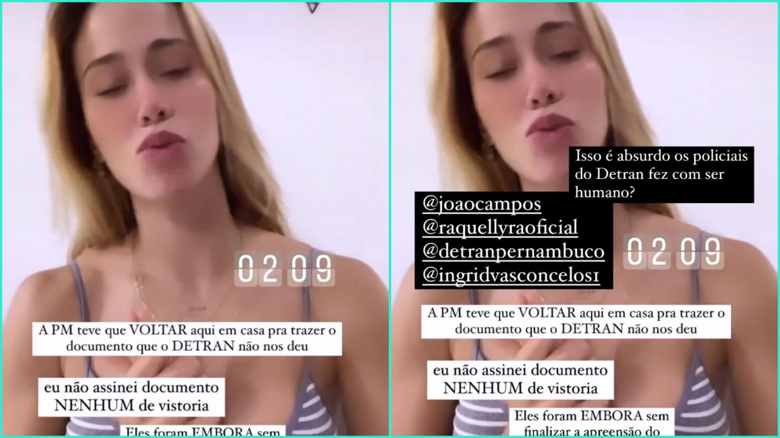 Da Redação do Blog — A influencer digital Ingrid Vasconcelos expôs na internet uma história no mínimo escabrosa envolvendo o pessoal do Departamento Estadual de Trânsito (Detran) de Pernambuco. Com mais de 420 mil seguidores no Instagram, ela afirma ter sido alvo de várias infrações após a apreensão do carro em uma blitz da Lei Seca.