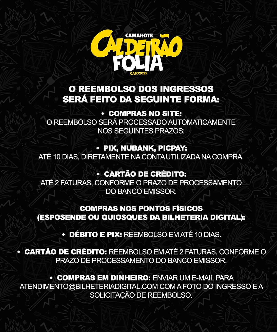 O reembolso dos ingressos será feito em até 10 dias para compras realizadas no débito e em até duas faturas no cartão de crédito.