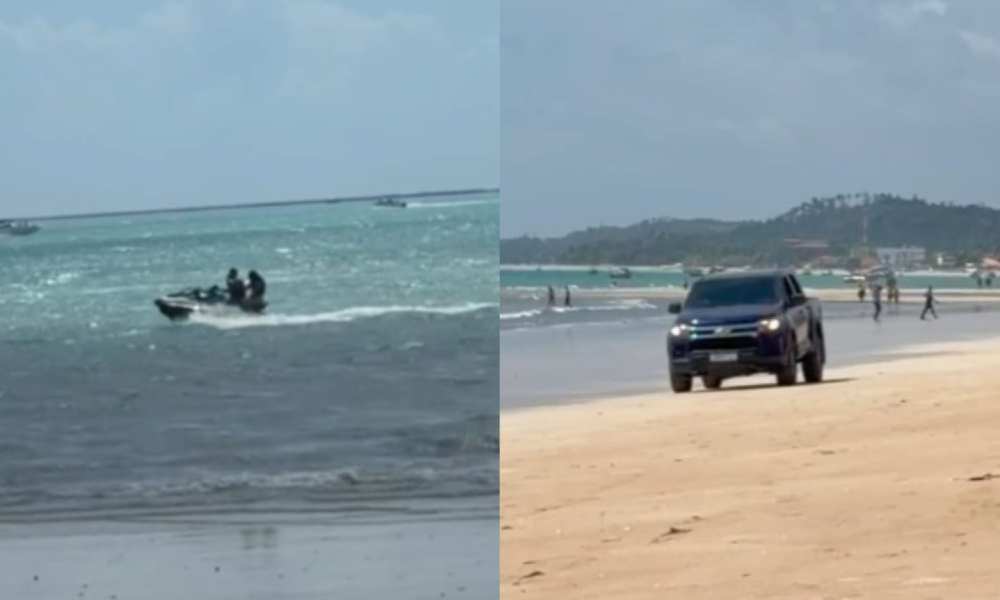Vídeos de leitor indignado com justa razão mostram jet skis de aluguel pilotados em alta velocidade se cruzando na beira da praia, com risco de atingir banhistas, enquanto uma camioneta circula impunemente na areia. Chamada, a polícia só apareceu muito depois.