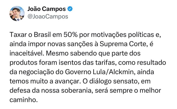 Candidato contra a reeleição de Raquel em 2026, Campos postou como “inaceitável” a sobretaxação de 50% sobre as importações brasileiras por motivos políticos e as sanções de Trump contra o ministro do STF (Supremo Tribunal Federal) Alexandre de Moraes.