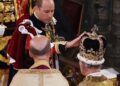 11. O príncipe William toca a coroa de Santo Eduardo na cabeça do rei Charles III durante cerimônia