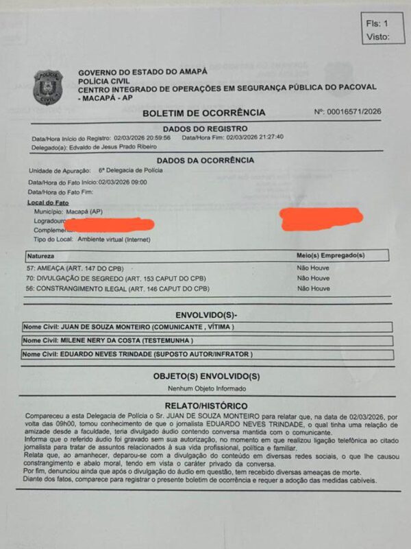 Nesta segunda-feira, 02, um Boletim de Ocorrência foi registrado e as autoridades já investigam os motivos das ameaças e os possíveis envolvidos. Um dos citados em áudio divulgado em Portais locais é Juarez Menescal, ex-secretário de Comunicação da Prefeitura de Macapá, exonerado após escândalos sobre verbas publicitárias no seu curto período de menos de 1 ano à frente da pasta (2025). Apesar de sair da Secom, ele continua atuando como assessor direto do prefeito no seu Gabinete e atuando nos bastidos da comunicação.