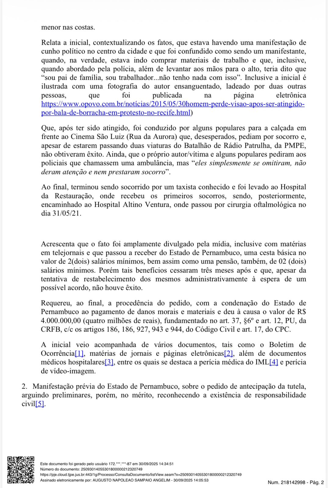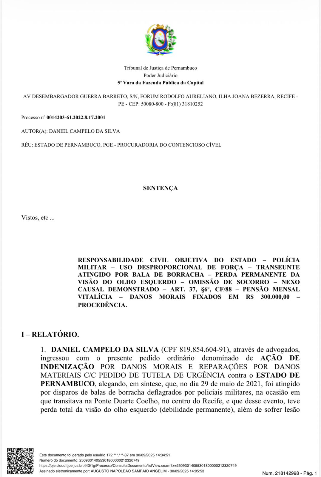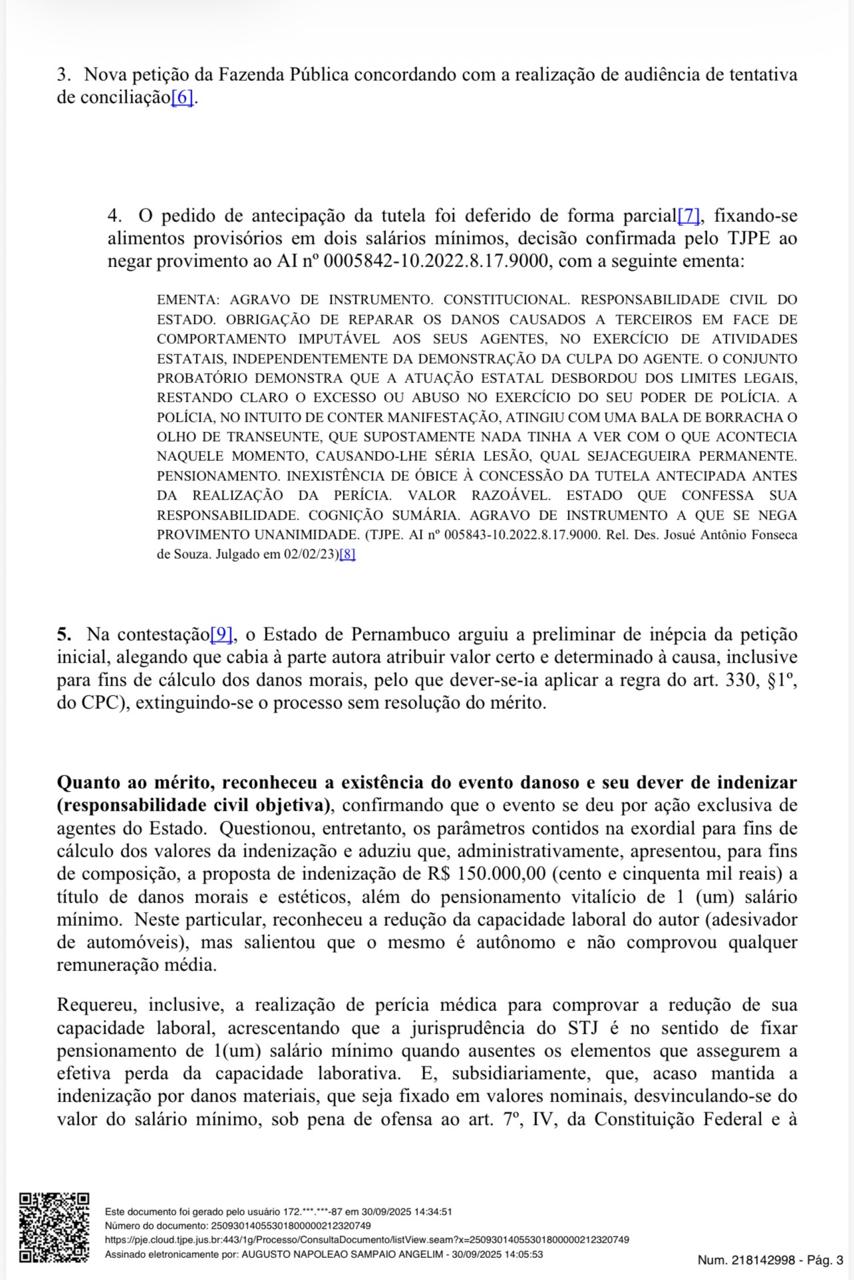 Da Redação do Blog – O juiz Augusto Napoleão Sampaio Angelim, da 5ª Vara da Fazenda Pública, dobrou o valor das indenizações do governo de Pernambuco ao adesivador Daniel Campelo da Silva, que ficou cego do olho esquerdo por uma bala de borracha disparada por policiais militares em manifestação contra o então presidente Jair Bolsonaro, na Ponte Duarte Coelho, no Centro do Recife, em 29 de maio de 2021.