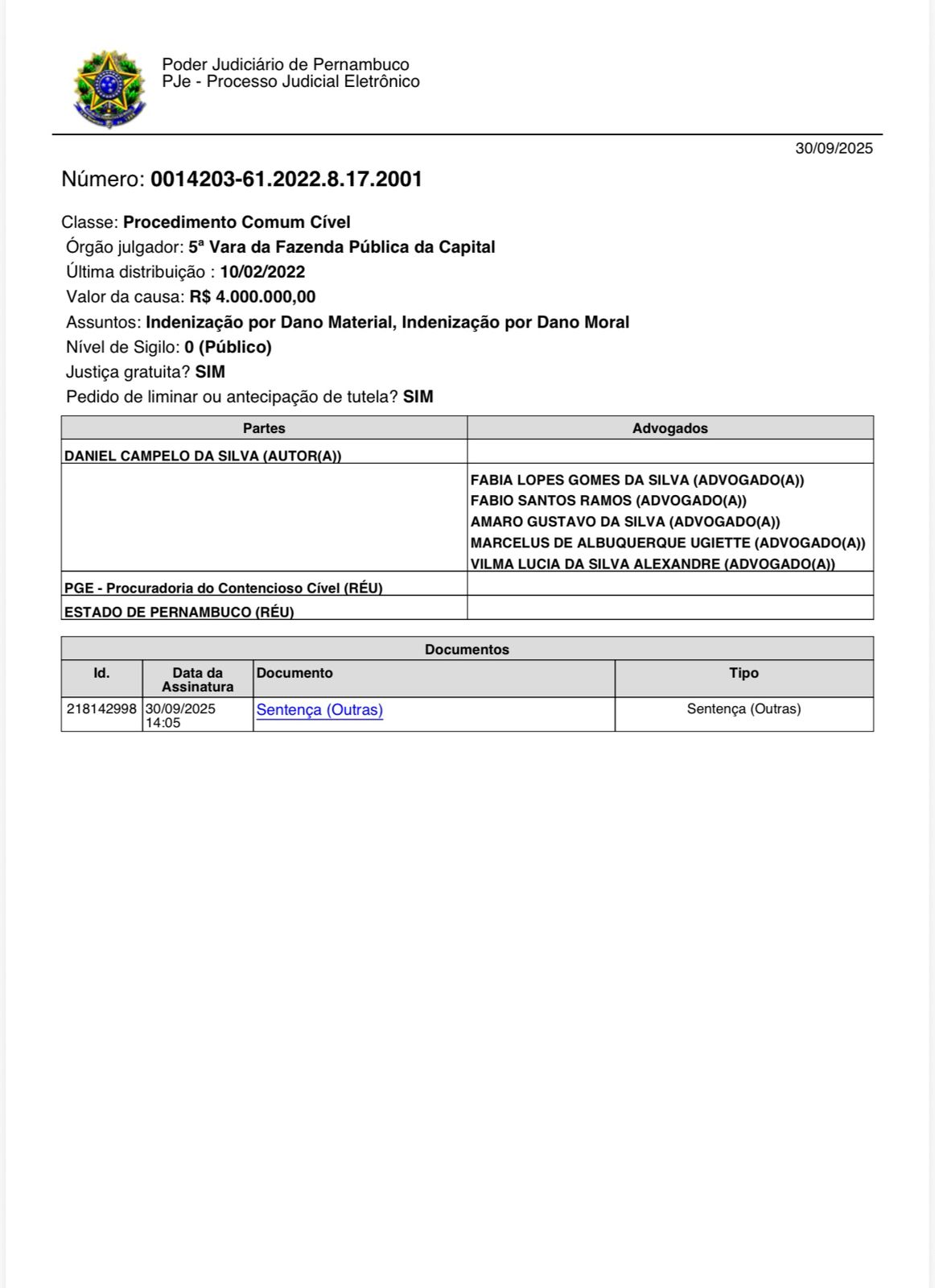 Fixou em R$ 300 mil e em pensão vitalícia de dois salários mínimos (atualmente R$ 3.036) as indenizações, desconsiderando proposta da Procuradoria-Geral do estado de R$ 150 mil e um salário-mínimo (R$ 1.518, hoje). A pensão vitalícia de dois mínimos havia sido fixada pelo TJPE (Tribunal de Justiça de Pernambuco) em recurso de Daniel Campelo da Silva e foi mantida pelo titular da 5ª Vara da Fazenda Pública.