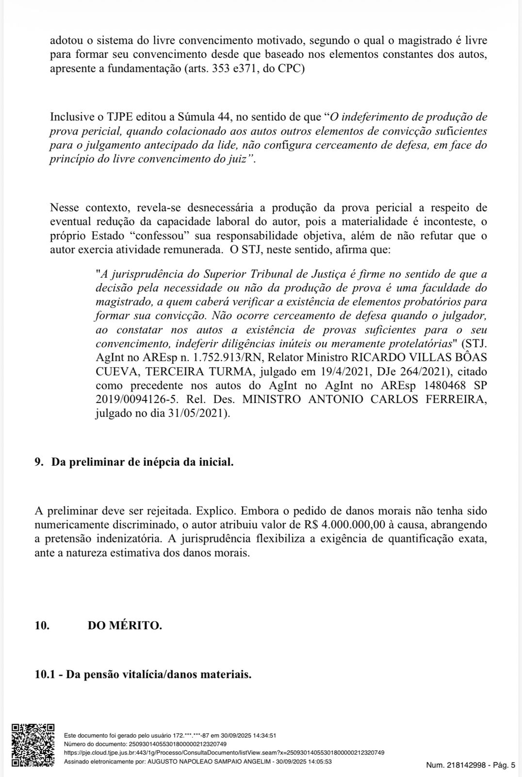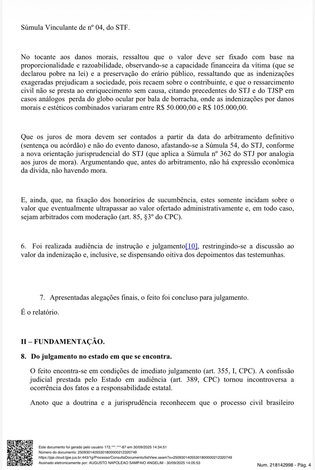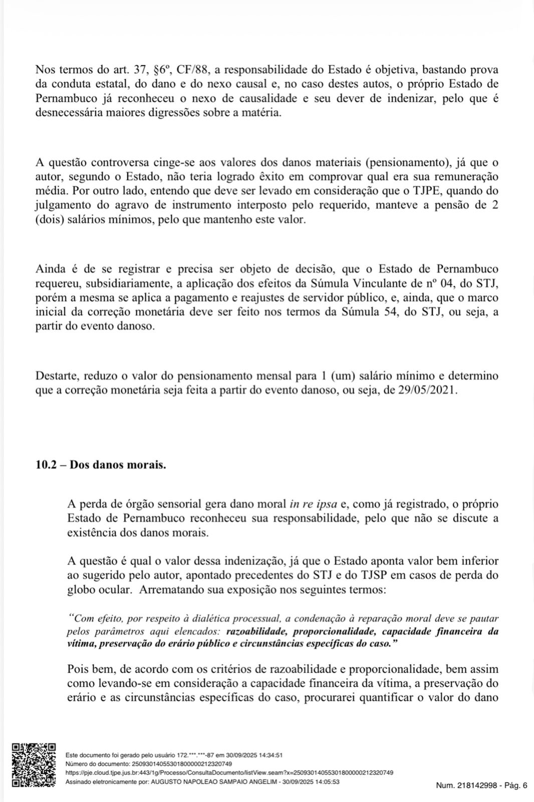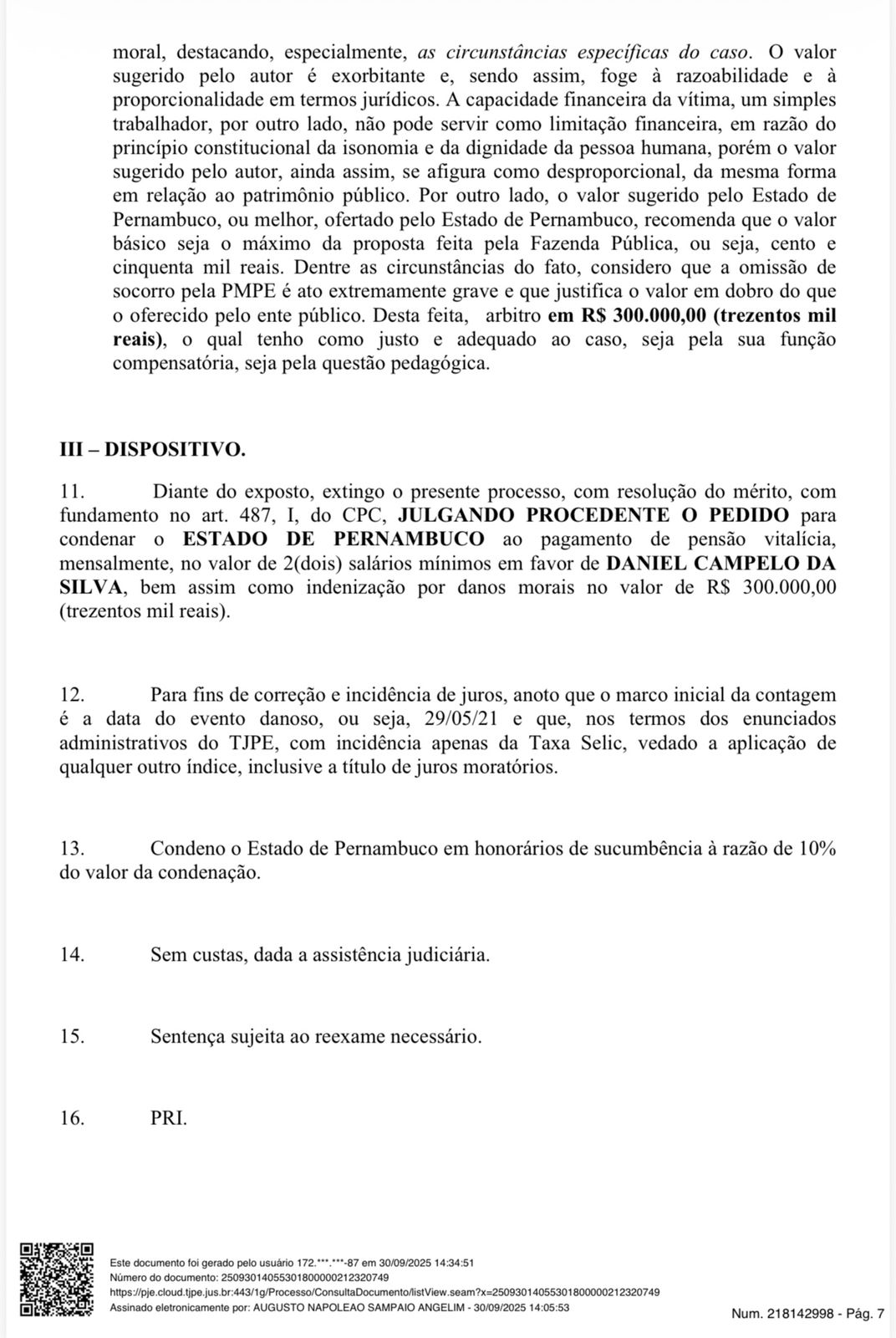 O juiz Augusto Napoleão Sampaio Angelim dobrou para R$ 300 mil a indenização devido à omissão de socorro da Polícia Militar, “ato extremamente grave”, escreveu ele na sentença. Negou, porém, por considerar excessivo, o valor de R$ 4 milhões solicitado por Daniel, defendido por cinco advogados, incluindo Marcelus de Albuquerque Ugiette.