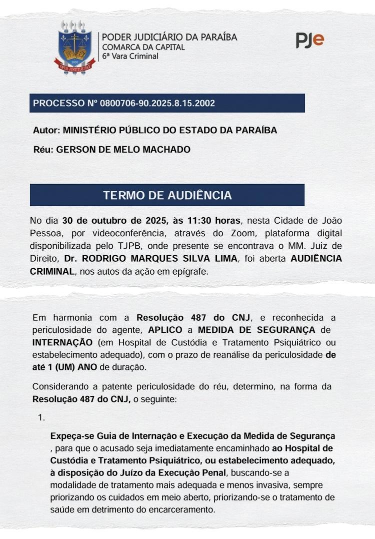 A coluna questionou o Tribunal de Justiça da Paraíba se houve alguma falha de comunicação que explicasse por que a juíza da audiência de custódia libertou Gerson, mesmo havendo uma decisão de internação, mas não houve resposta até o momento.