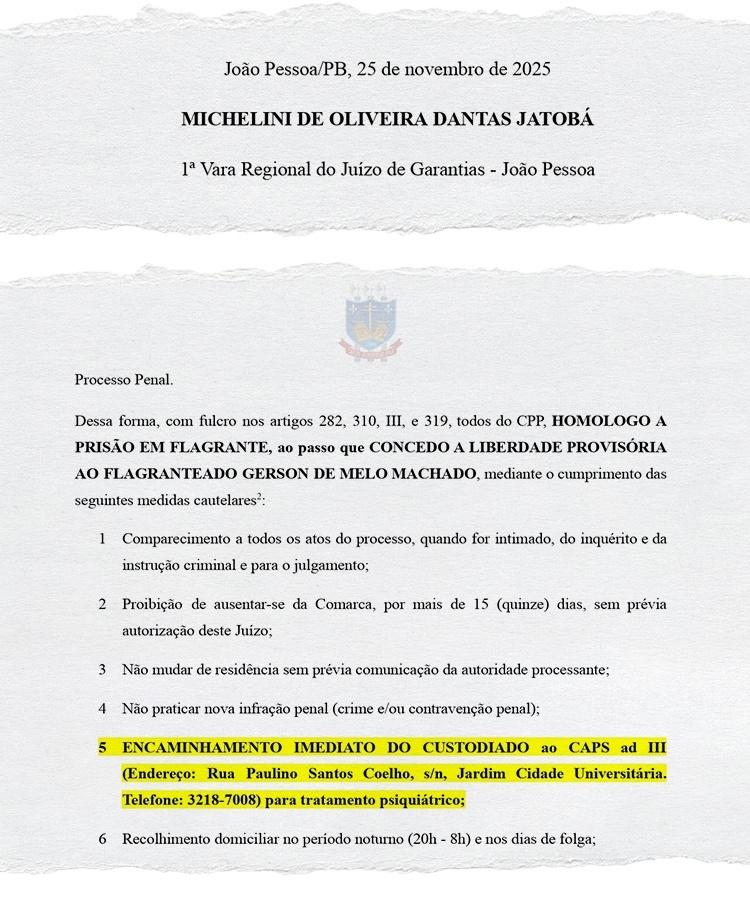 Na audiência de custódia do dia seguinte, a juíza Michelini de Oliveira Dantas Jatobá, da 1ª Vara Regional de Garantias de João Pessoa, ignorou a ordem de internação e liberou Gerson, encaminhando-o para tratamento psiquiátrico em um Caps (Centro de Atenção Psicossocial), que não realiza internações de longo prazo.